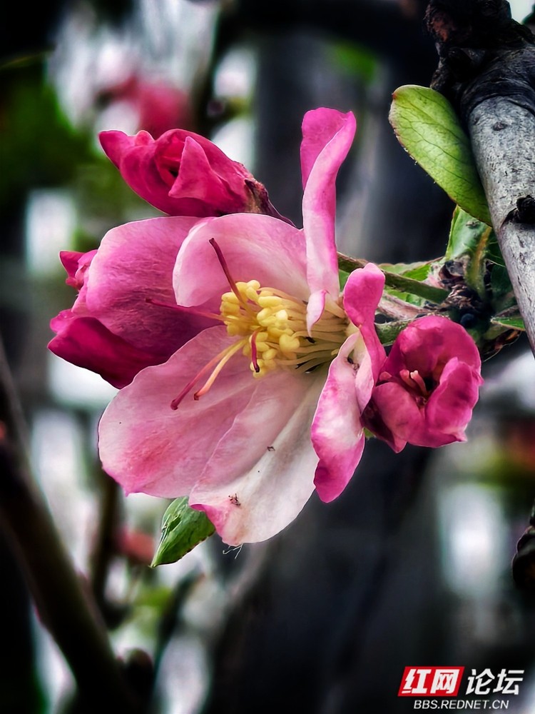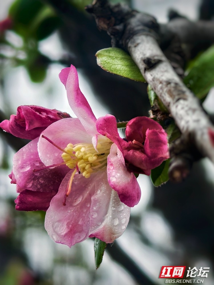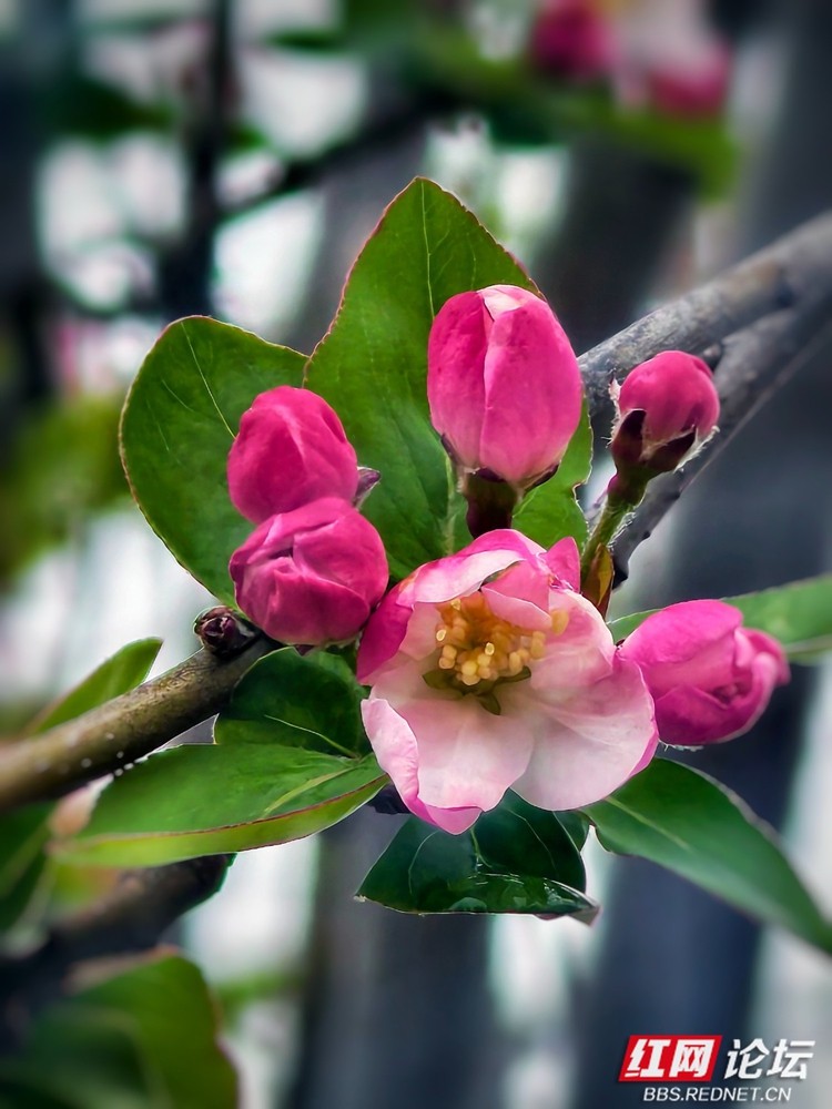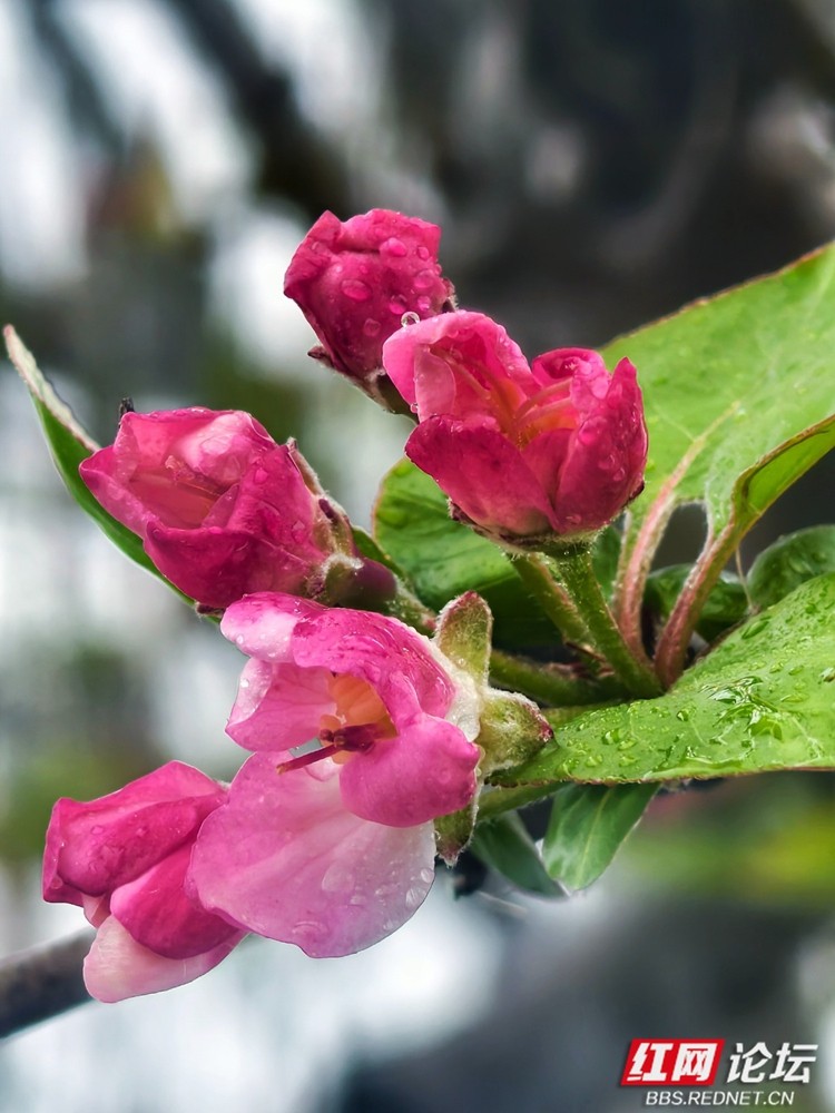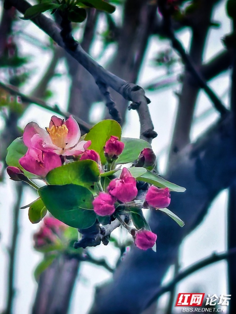 即便时光流转,春风依旧如约而至,在安乡的枝头唤醒了这惊世的红妆。这些西府海棠,仿佛是从旧时光里走出的“花中神仙”,半含半放间,尽是欲语还羞的娇态。那一抹红,浓时如醉酒的贵妃,淡处似初妆的少女,将高雅与纯洁揉碎在细雨微风中。