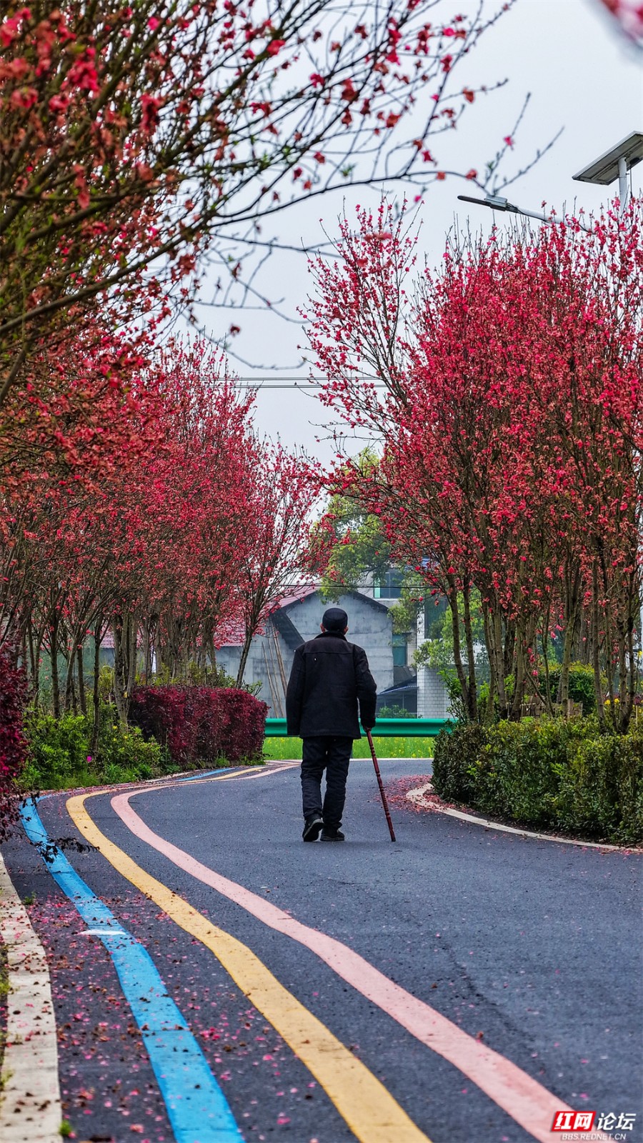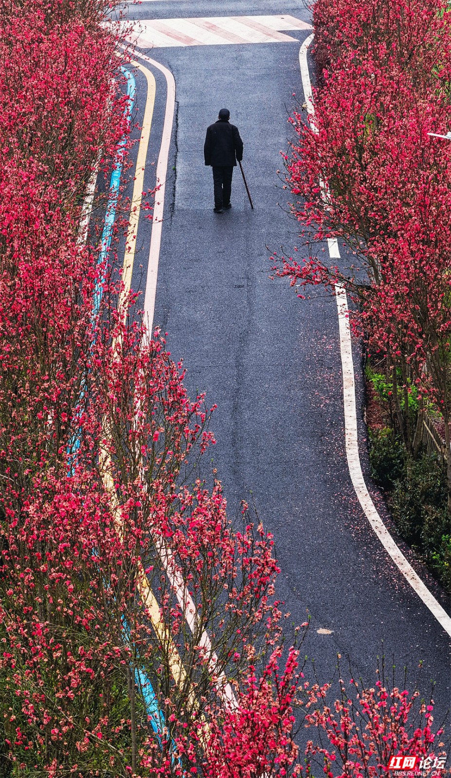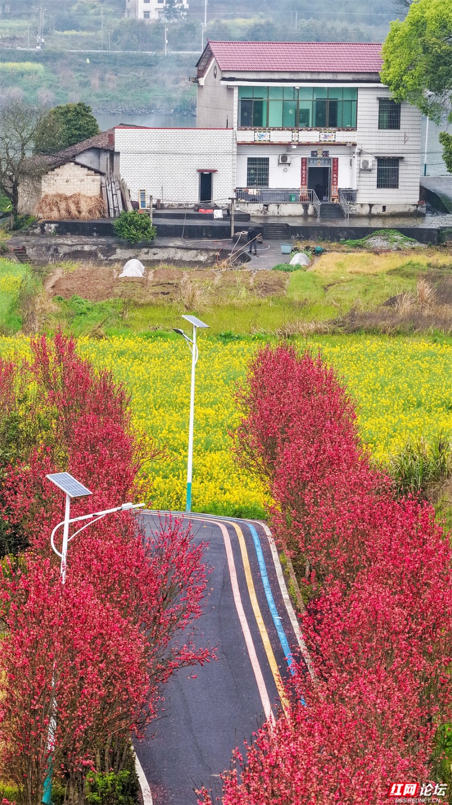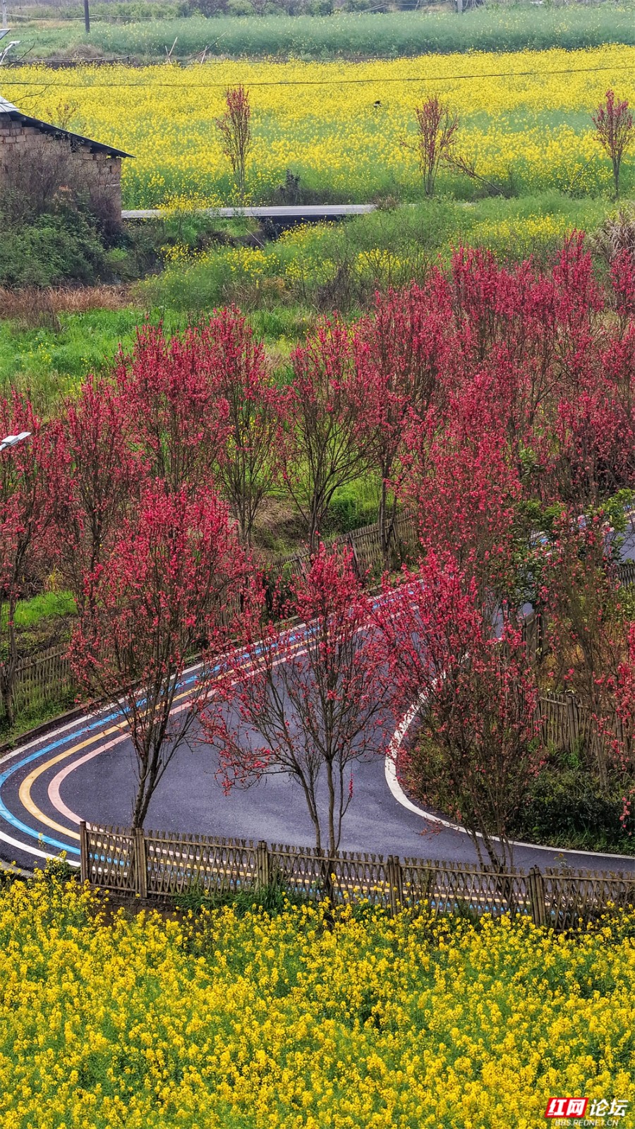 在株洲市渌口区龙船镇挽洲村,春天是这样铺开的——两排桃树对望成廊,玫红、粉白的花枝坠成低垂的云,风一经过,便簌簌落成路边的诗。一条蜿蜒的公路穿过花海,蓝、黄、粉的标线像是大地的彩虹,引着人向更深的花意里走去。