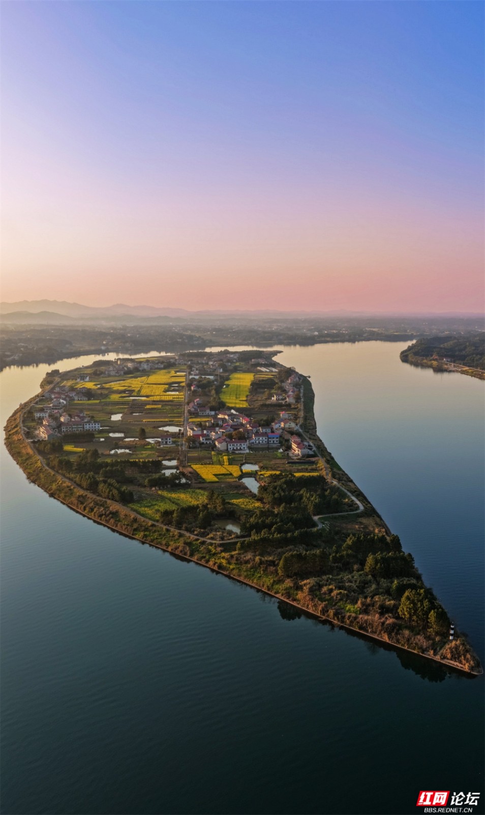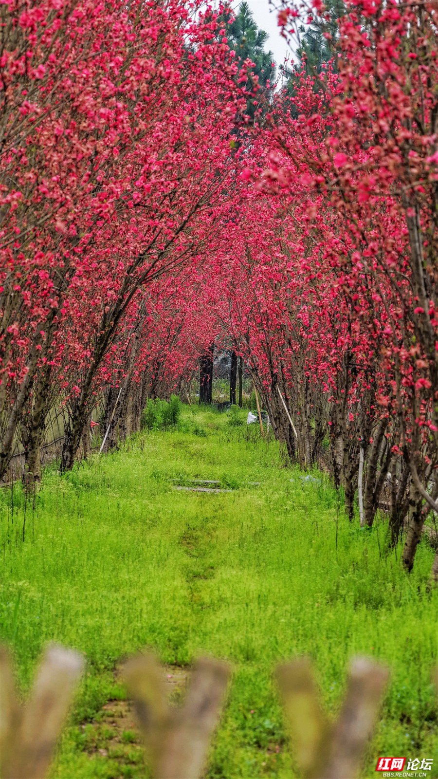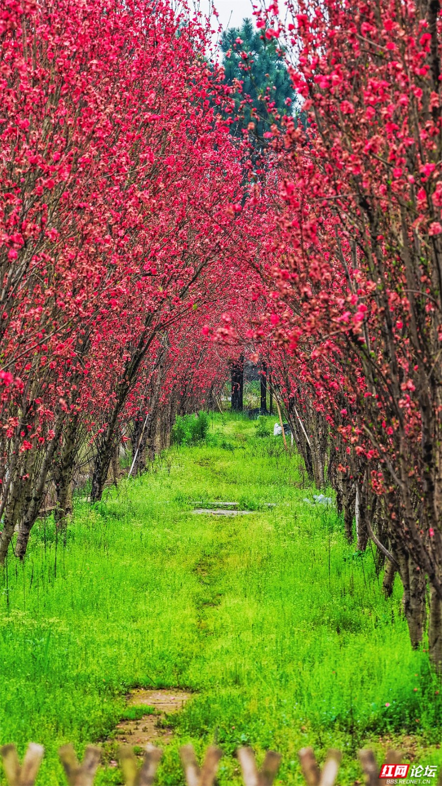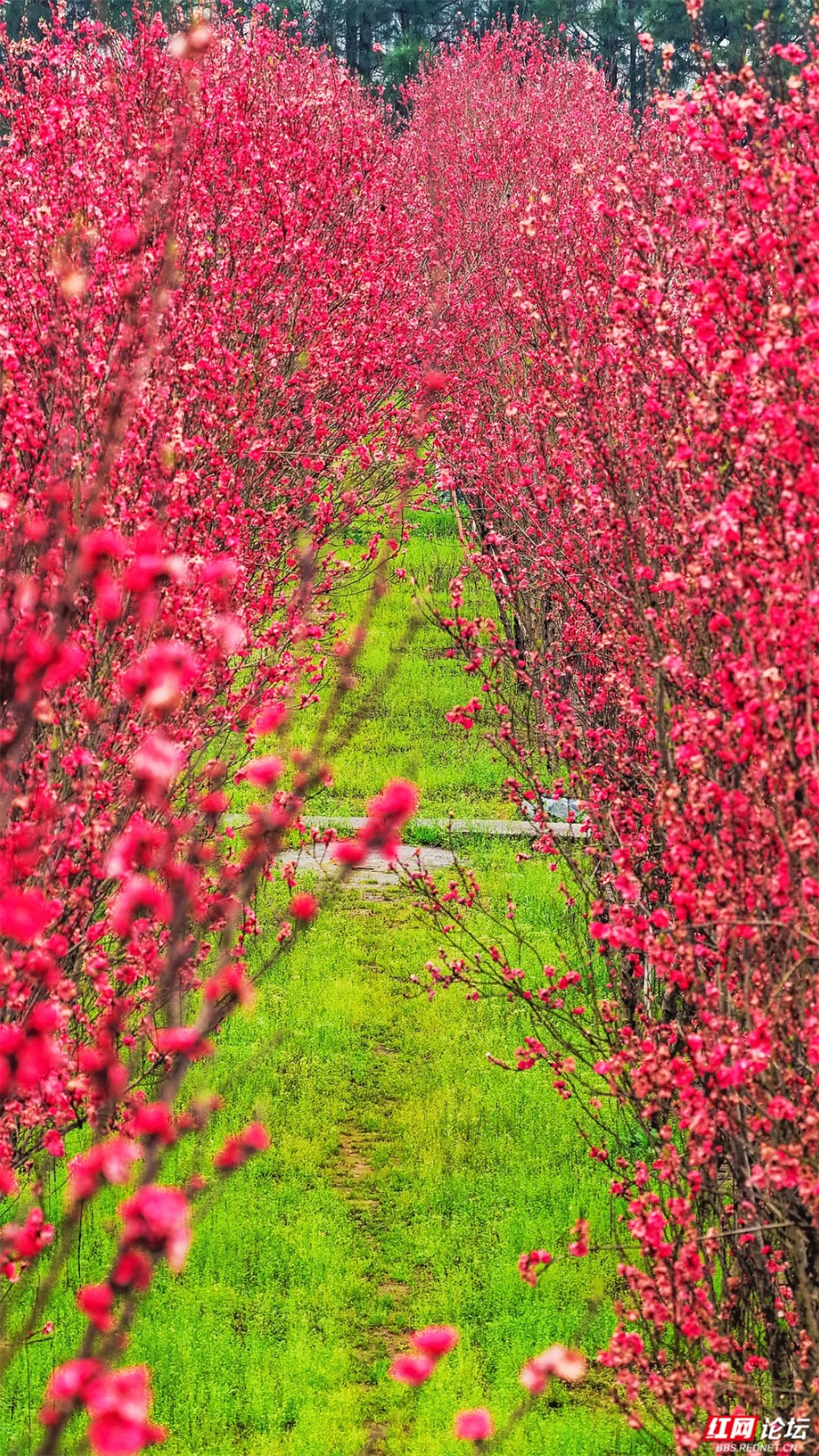 在株洲市渌口区龙船镇挽洲村,春天是这样铺开的——两排桃树对望成廊,玫红、粉白的花枝坠成低垂的云,风一经过,便簌簌落成路边的诗。一条蜿蜒的公路穿过花海,蓝、黄、粉的标线像是大地的彩虹,引着人向更深的花意里走去。