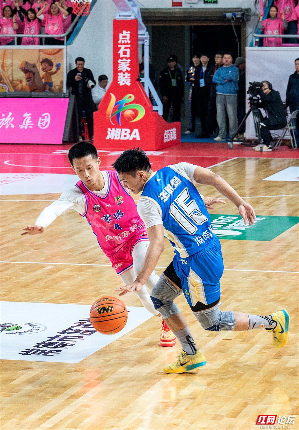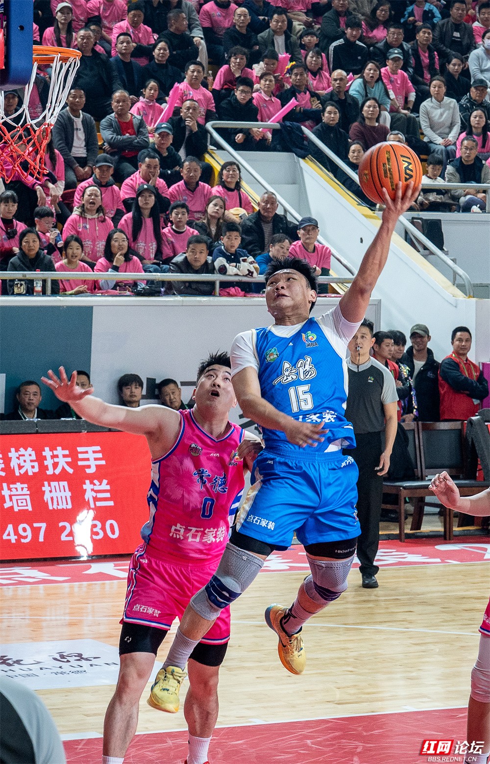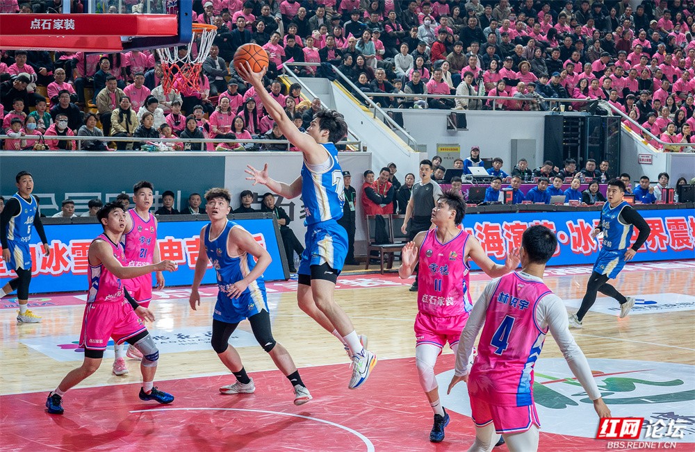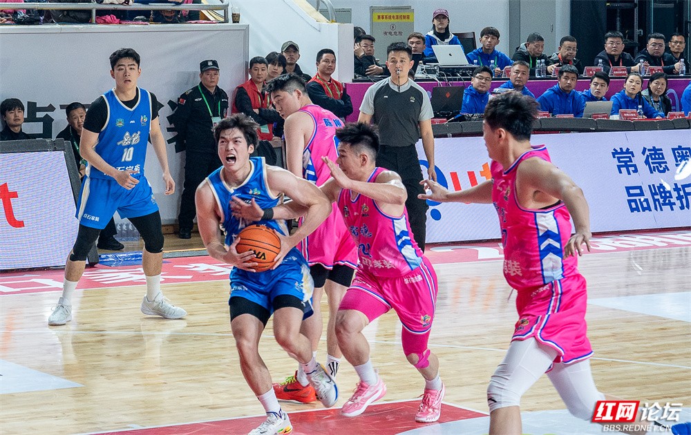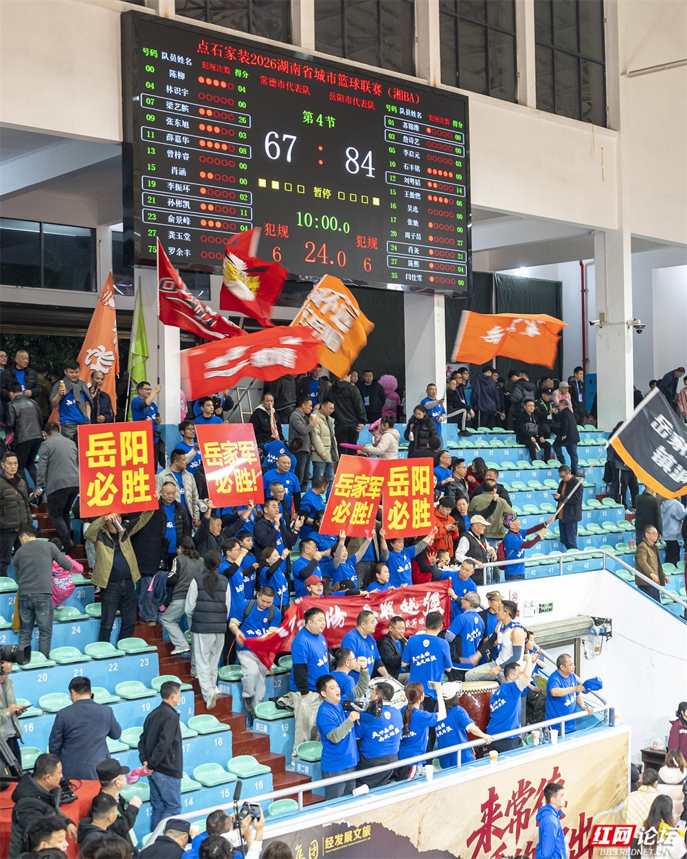 面对主场作战的对手,岳阳队队员迅速进入状态。球场上,身穿蓝色战袍的球员频频发力,15号高高跃起上演精彩上篮,10号稳持篮球寻找进攻机会,7号持球快速突破防线……全队凭借流畅的配合与稳定的发挥,始终掌控着比赛节奏。看台上,远征的岳阳球迷方阵同样气势如虹,他们高举“青春岳家军 燃爆湘BA”“岳阳必胜”的旗帜,用呐喊与鼓点为球队注入源源不断的动力。