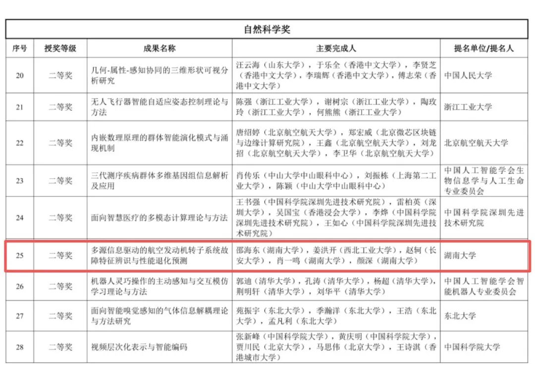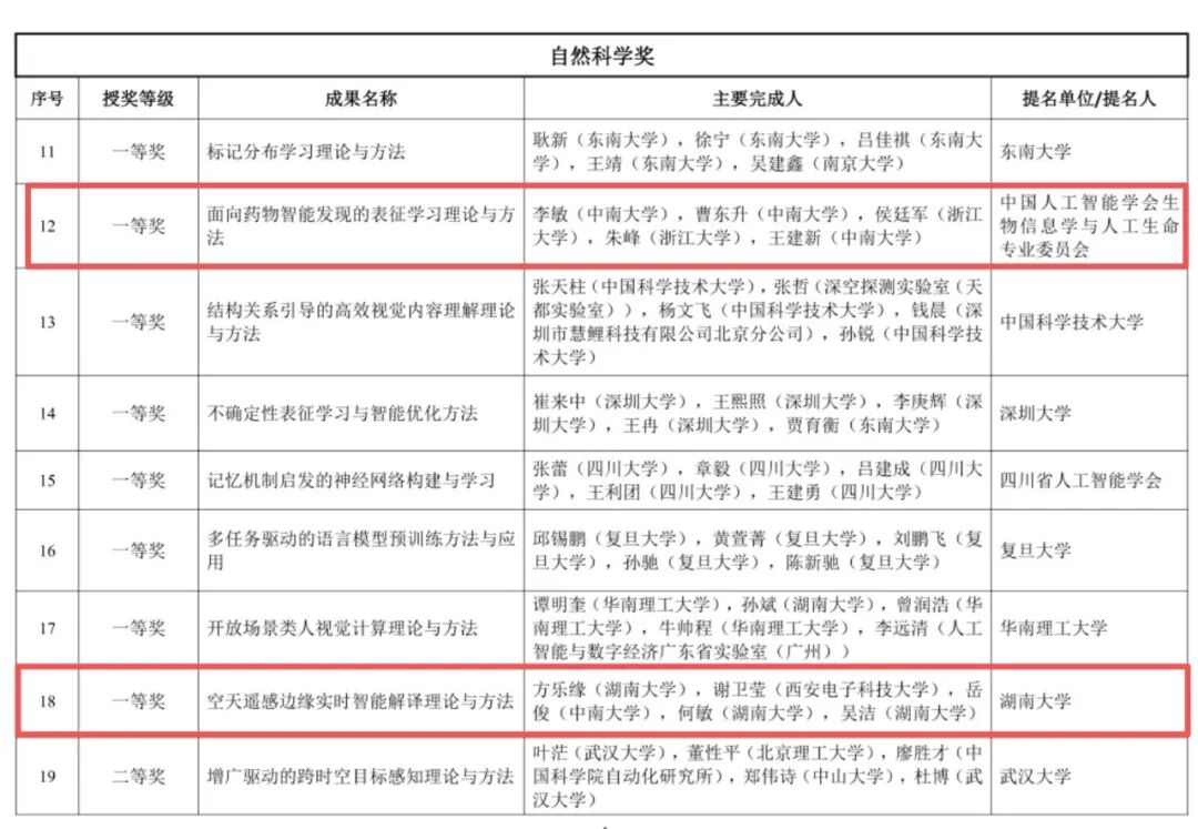 多个由湖南团队牵头的创新成果和青年科技工作者在本届评选中脱颖而出。其中,中南大学李敏团队的“面向药物智能发现的表征学习理论与方法”、湖南大学方乐缘团队的“空天遥感边缘实时智能解译理论与方法”成果获自然科学奖一等奖;国防科技大学陈盈果团队的“异构空天平台全链路动态管控关键技术及应用”成果获科技进步奖一等奖;湖南大学邵海东团队的“多源信息驱动的航空发动机转子系统故障特征辨识与性能退化预测”成果获自然科学奖二等奖;国防科技大学田植良获青年科技奖。