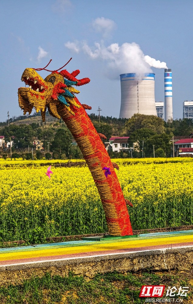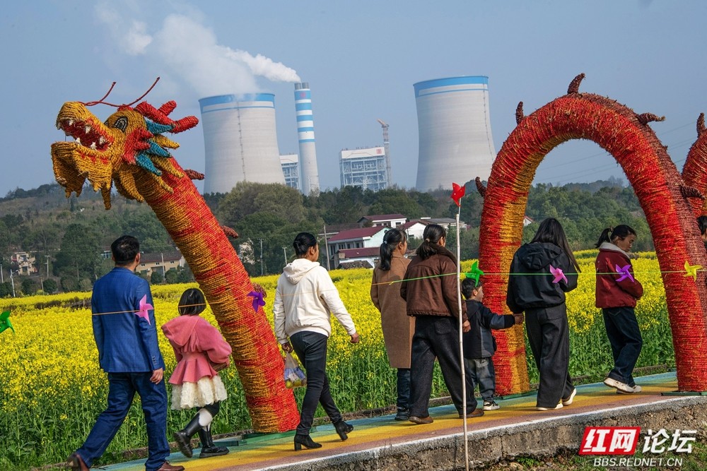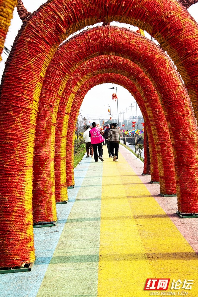 在这片金色的梦境中,最夺目的莫过于那条蜿蜒在花田里的“草编巨龙”。它衔着春光,守护着脚下的七彩步道。游人漫步其间,每一步都踏着彩虹,每一眼都撞进色彩的怀抱。那些粉的娇羞、白的纯净、橙的明艳,打破了人们对油菜花只有金黄的刻板印象,像是春天最浪漫的意外惊喜。
