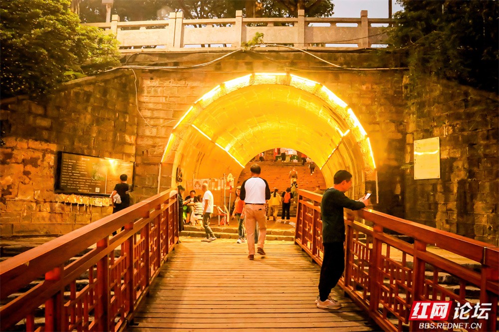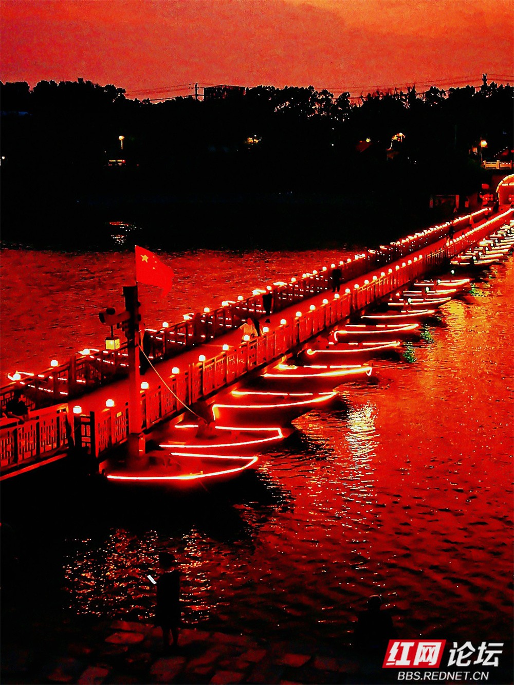暖黄色的光带沿浮桥蜿蜒铺展,与江中荡漾的波光静静交融。晚风轻拂,灯影随之摇曳,勾勒出一幅朦胧而雅致的潇湘夜景。眺望远处古城门,夜色与光影交叠,厚重历史与人间烟火在此悄然相遇,仿佛时光在此温柔驻足。