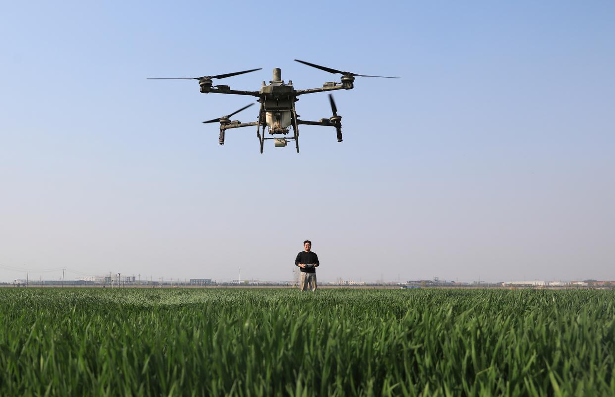 3月20日,在河南省焦作市温县黄河滩区,无人机手操作无人机进行小麦春管作业。(新华社)