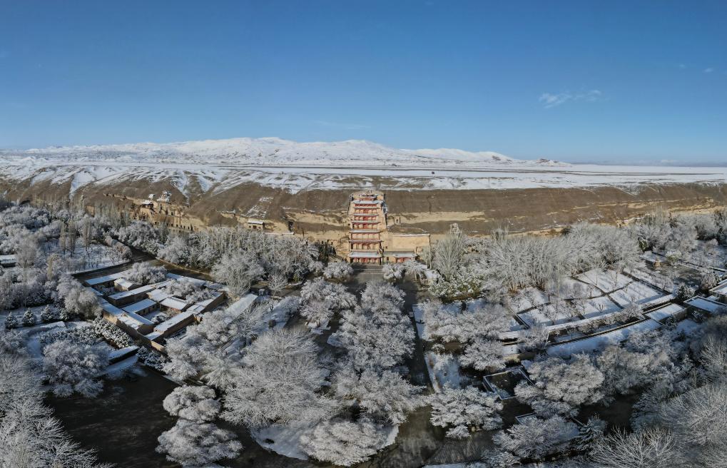 敦煌莫高窟景区雪景(无人机照片)。 新华社记者张智敏 2022年3月25日摄