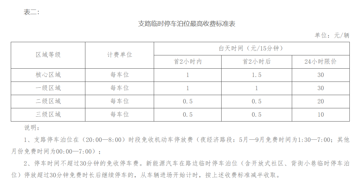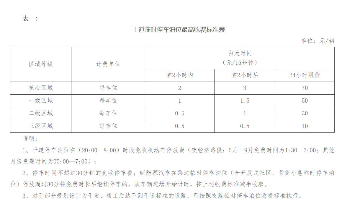 《通知》提出,明确干道临时停车泊位24小时最高限价,核心区、一级区、二级区、三级区24小时最高限价分别为70元、50元、30元、10元。同时明确核心区支路24小时最高限价由40元降为30元。