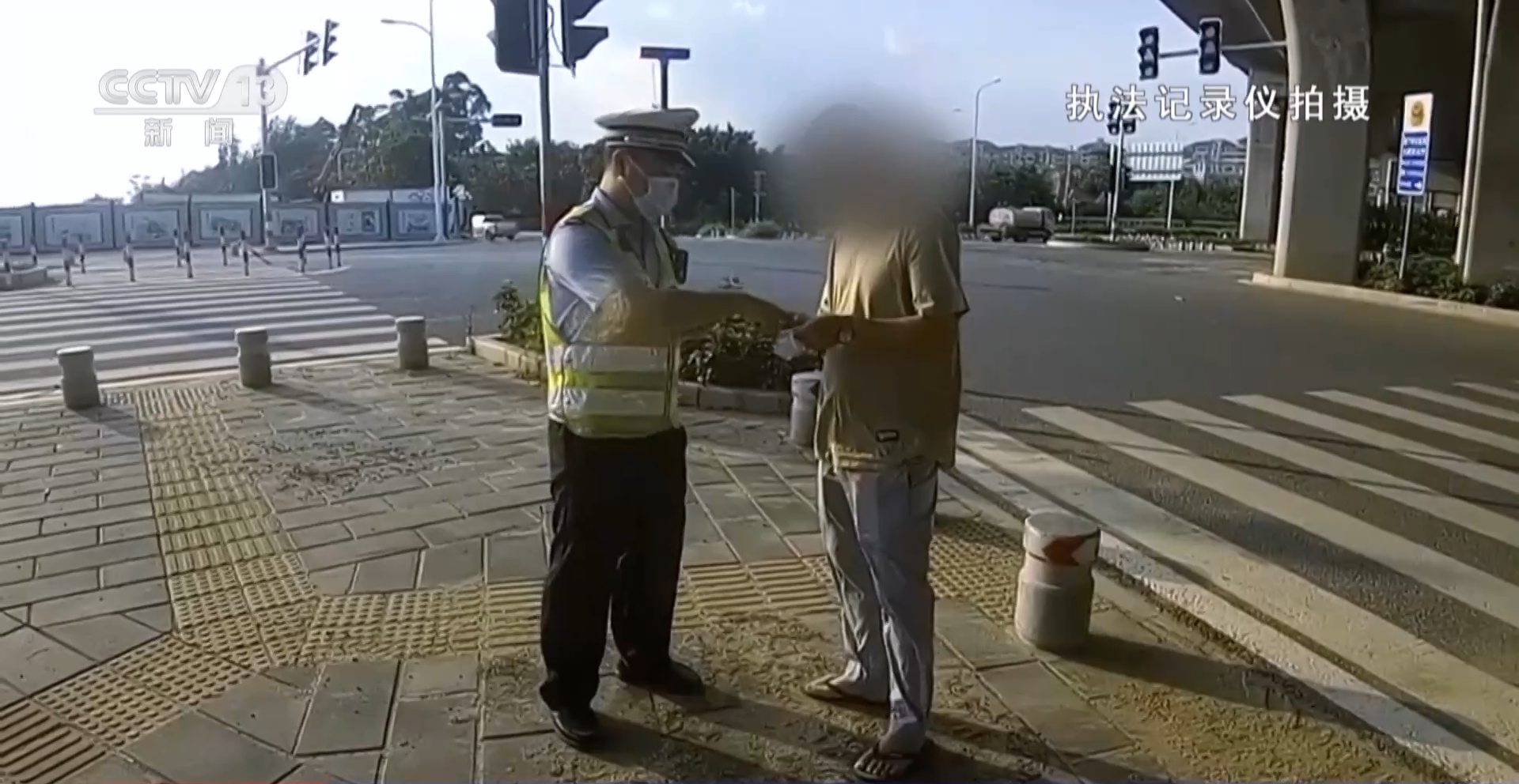 交警:来,你好,交警,我现在给你普法一下,从8月1日开始,过斑马线是不能低头玩手机的,是由条款规定的。我不给你罚款,是给你警告一下。