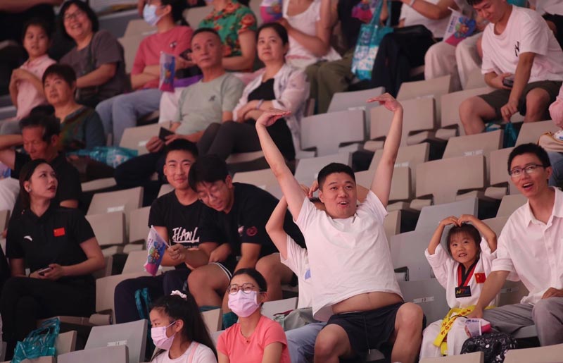 DJ出手,大声跟唱是初级“显眼包”。每当DJ根据现场氛围放出BGM时,场馆内的氛围都会更上一层楼。前有游泳场内的《千年等一回》引发合唱大高潮,后有跆拳道馆里《最美的太阳》让场内的年轻人们过了一把KTV的瘾。“我就是来解压的!感觉前段时间赶作业太苦了,来看比赛不仅在给中国队加油时可以大喊出来,没想到还能大声唱歌释放压力。来现场真是太爽了!”在临安体育文化会展中心体育馆观看跆拳道比赛的观众告诉记者。