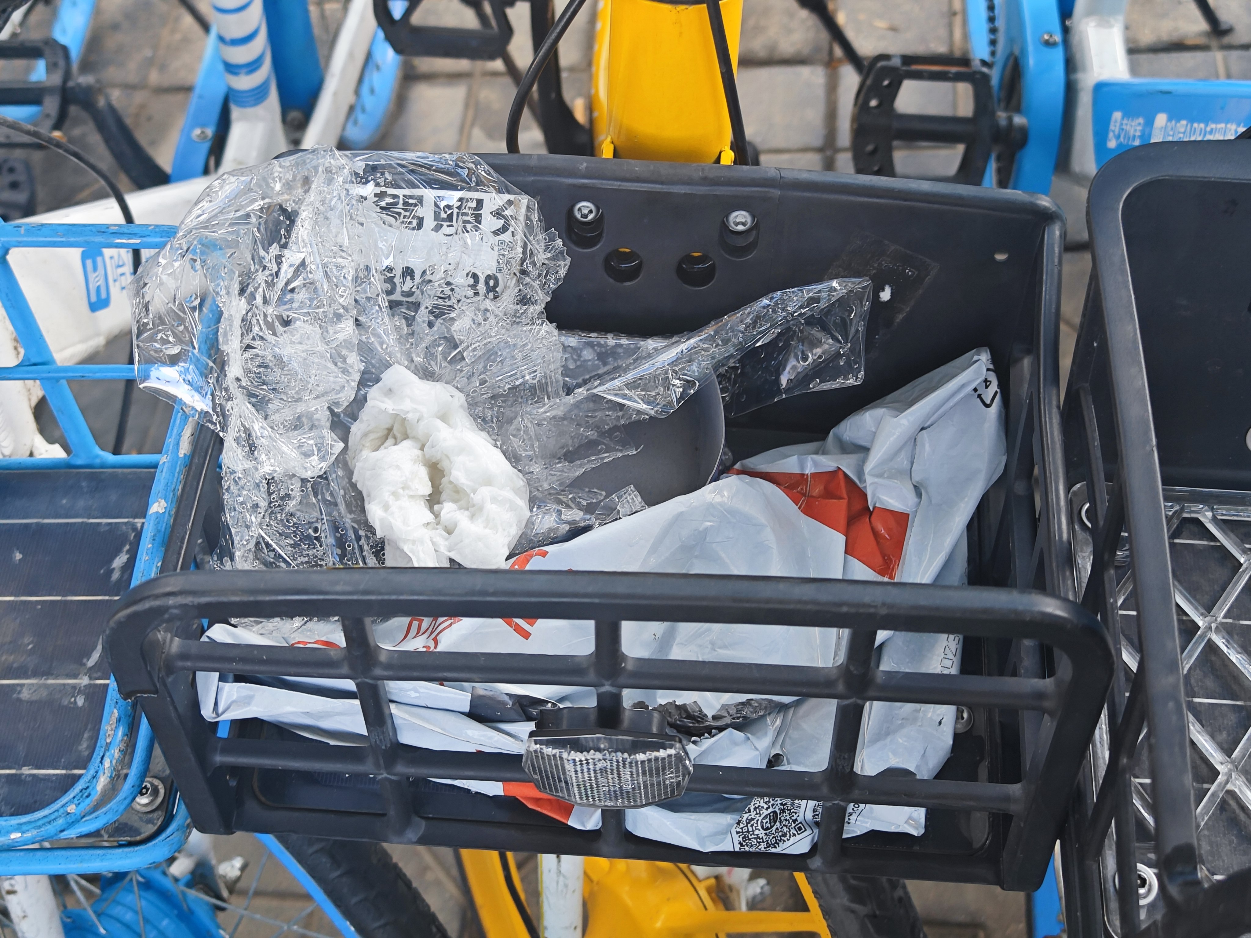 从雍和宫大街一路向南,不时能看到共享单车车筐里扔进了各种各样的垃圾。其中,空矿泉水瓶最多,其次是食品包装袋、用过的口罩及外包装、纸巾等等。