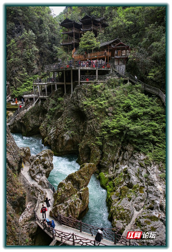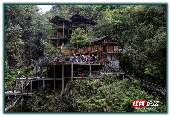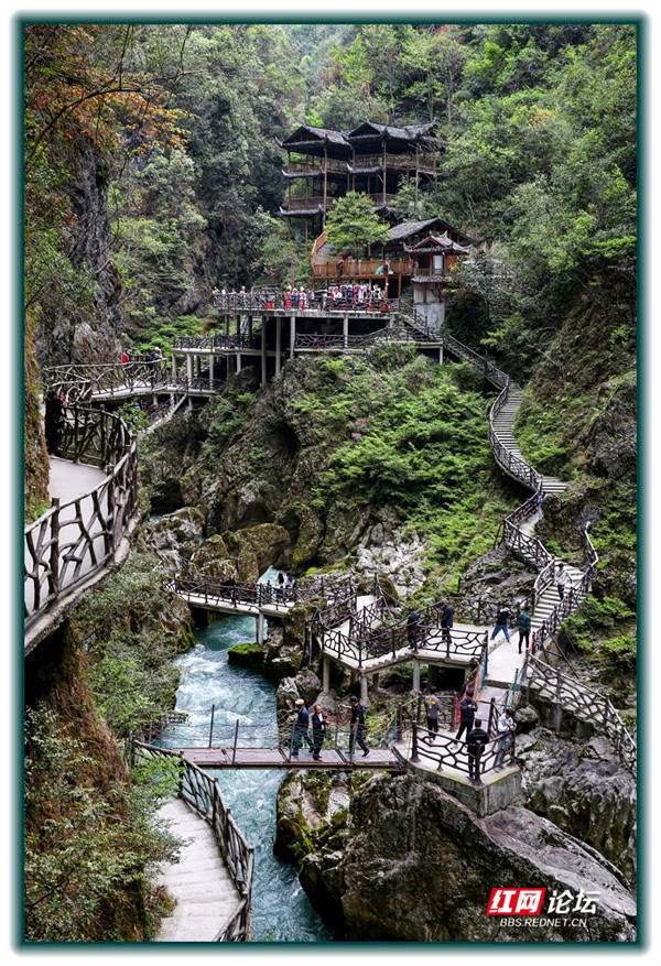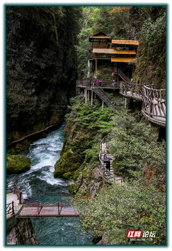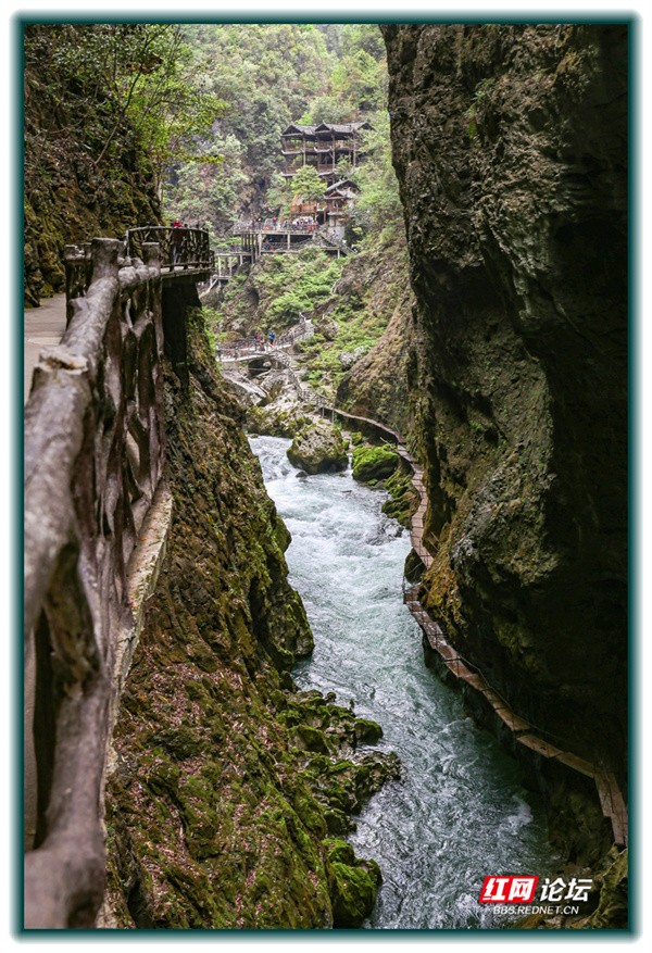 一线天居于铜仁大峡谷中段幽邃的峡谷中,峡谷像是被利斧劈开的一样,长约二百多米,两边石壁高300多米,最窄处仅仅4米,石壁上的树相互连接在一起,从中漏进天光一线,有鬼斧神工之奇。栈道距河道30米,游人可在欣赏一线天神奇美景的同时与漂流的游客互动。
