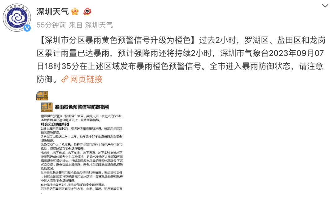 【深圳市分区暴雨黄色预警信号升级为橙色】过去2小时,罗湖区、盐田区和龙岗区累计雨量已达暴雨,预计强降雨还将持续2小时,深圳市气象台2023年09月07日18时35分在上述区域发布暴雨橙色预警信号。全市进入暴雨防御状态,请注意防御。