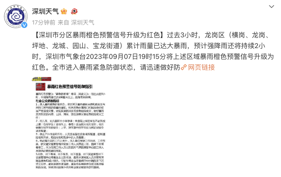 【深圳市分区暴雨橙色预警信号升级为红色】过去3小时,龙岗区(横岗、龙岗、坪地、龙城、园山、宝龙街道)累计雨量已达大暴雨,预计强降雨还将持续2小时,深圳市气象台2023年09月07日19时15分将上述区域暴雨橙色预警信号升级为红色。全市进入暴雨紧急防御状态,请迅速做好防御工作。