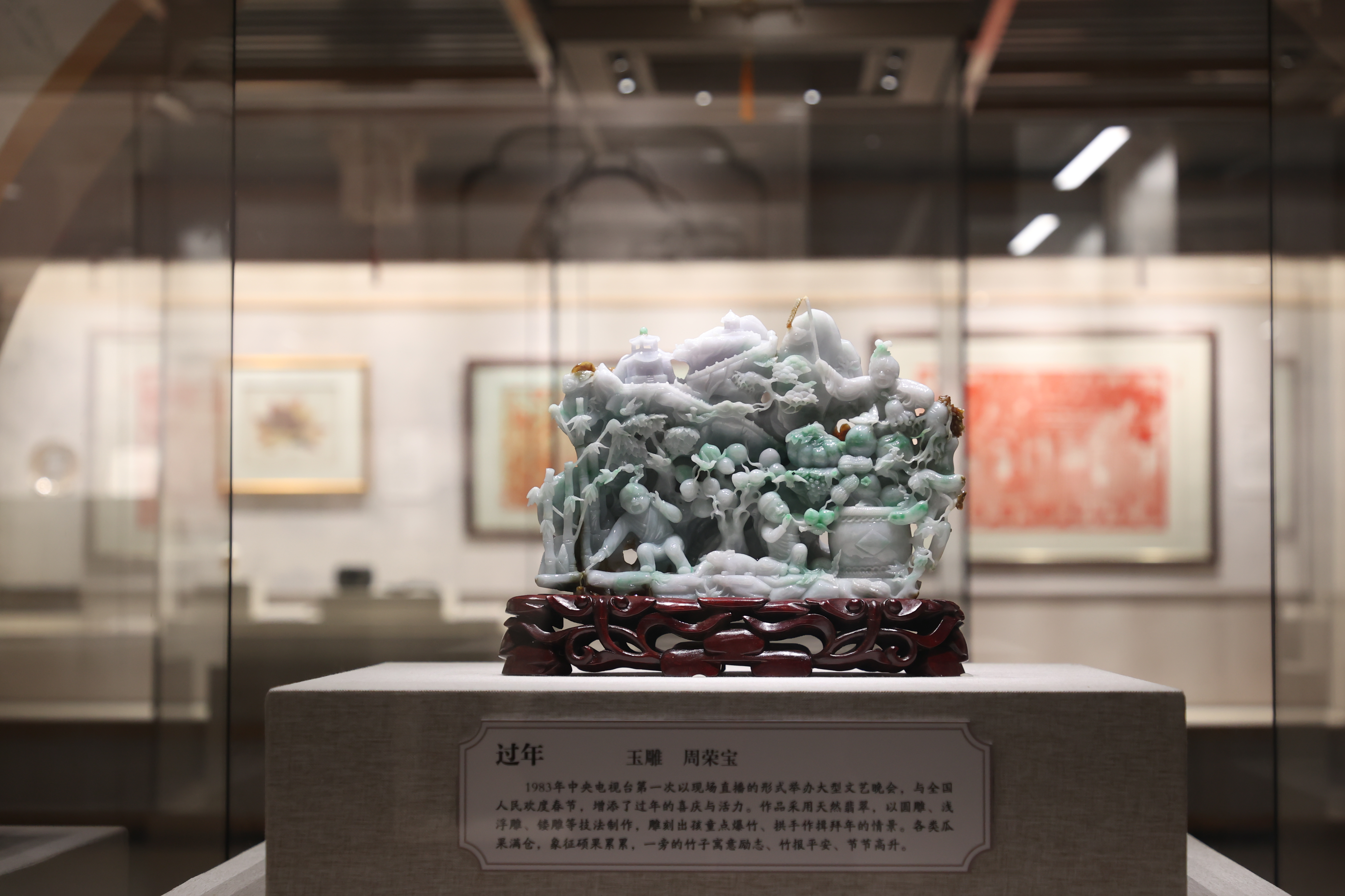 岁末之际,展览特意遴选了过年主题的展品,并设置了新年打卡等场景,将新春元素融入设计细节中。展厅二楼中心柜的一件玉雕作品即命名为《过年》,手工匠人采用天然翡翠,以圆雕、浅浮雕、镂雕等技法制作,活灵活现地呈现出孩童点爆竹、拱手作揖拜年的情景。名为《春暖花开》的桃花坞木版年画则通过强烈的色彩对比,营造出喜庆祥和的新年气氛。
