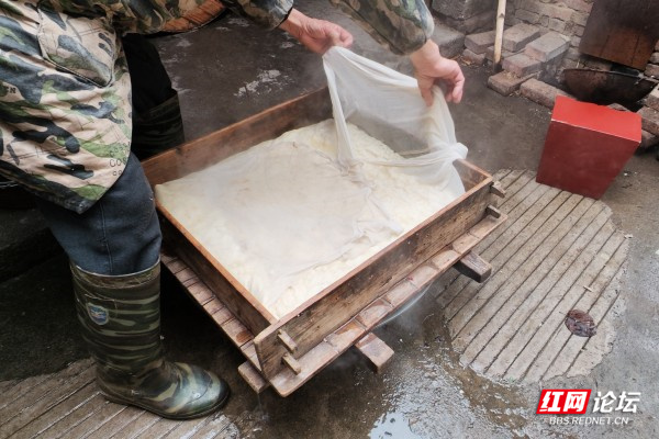 雅山村的农民过年打豆腐是因为“豆腐”与“头富”谐音,寄予人们新年要富贵的心愿。在农村有“腊月二十五,推磨做豆腐”的顺口溜。这是一个由来已久的传统。我和西家老板聊着打豆腐的话题,他不急不慢的跟我说,要豆腐好吃,首先是要自家种的黄豆,然后就是有一点技术含量,主要的技术在石膏,石膏分生石膏和熟石膏,熟石膏是要经过柴火烧熟以后捣碎,这样做出来的豆腐就嫩,最好吃。如果是要吃豆腐老和做霉豆腐,就一定要用熟石膏,如果是做油豆腐,那就要用生石膏。对于农村人来说,他们都是自己种豆,做出自己家里最环保的、最香、最有年味的豆腐,让在外地工作回家的儿女们、儿孙们好好吃上,就选择在过年的时候打豆腐。