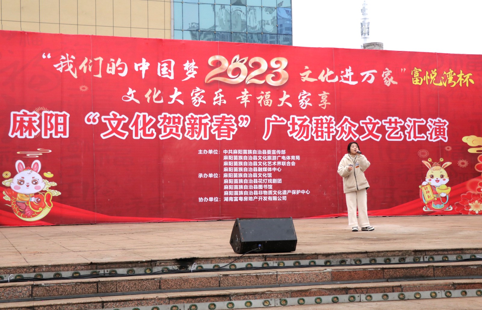1月22日上午,大年初一的麻阳苗族自治县县城锦江广场,停了三年的麻阳“文化贺新春”广场群众文化活动重新启动。当天举办的青年歌手大奖赛预赛上,30位本地青年歌手竞相放歌,新年的苗乡广场热闹非凡。