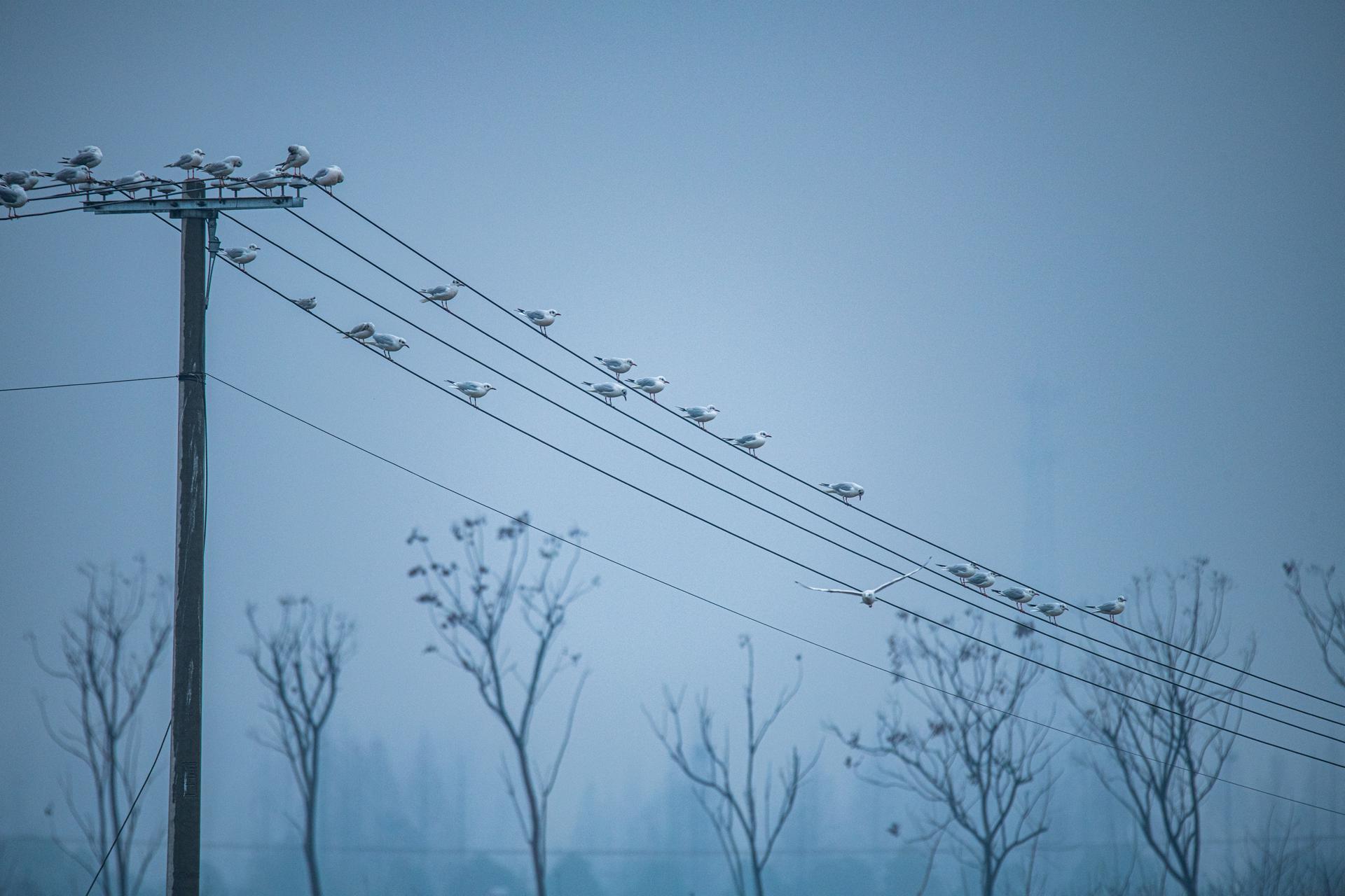 18日下午3点半左右,刘科在采桑湖大堤外侧养鱼的池塘边拍到一大片西伯利亚银鸥,每一只都胖嘟嘟的。它们错落有致地站在电线杆上,“有像五线谱一样的美感”。
