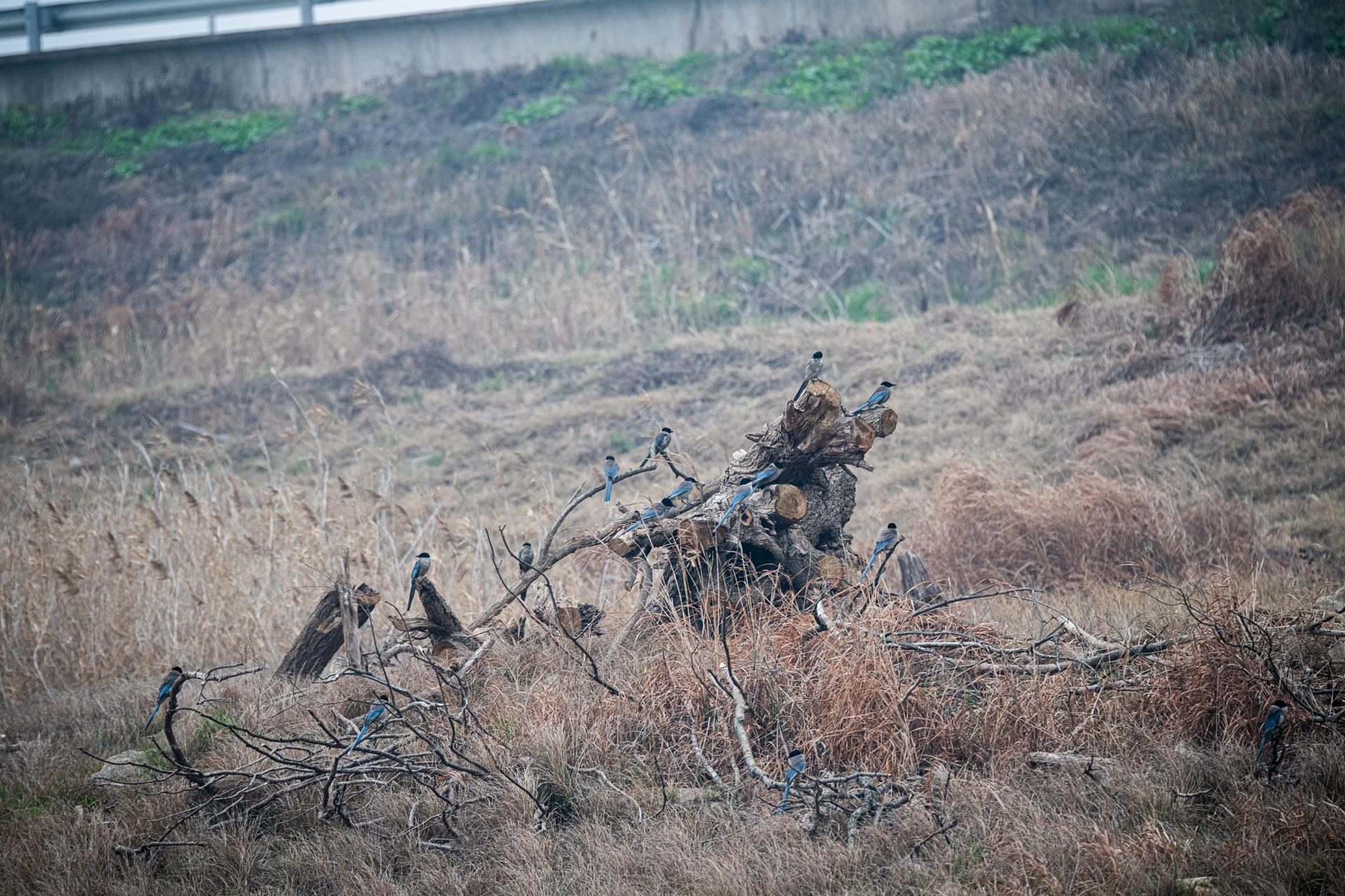 一大群灰喜鹊,有十来只,在刘科与队友路过一块田埂时,从草丛里飞出来落在枯树枝上,羽毛蓝蓝的。“我们在城市里看到的喜鹊通常是黑白相间,而我们拍到的灰喜鹊是蓝灰相间的羽毛。如果今天天气好,在阳光下灰喜鹊的羽毛会散发出金属光泽。”刘科说。