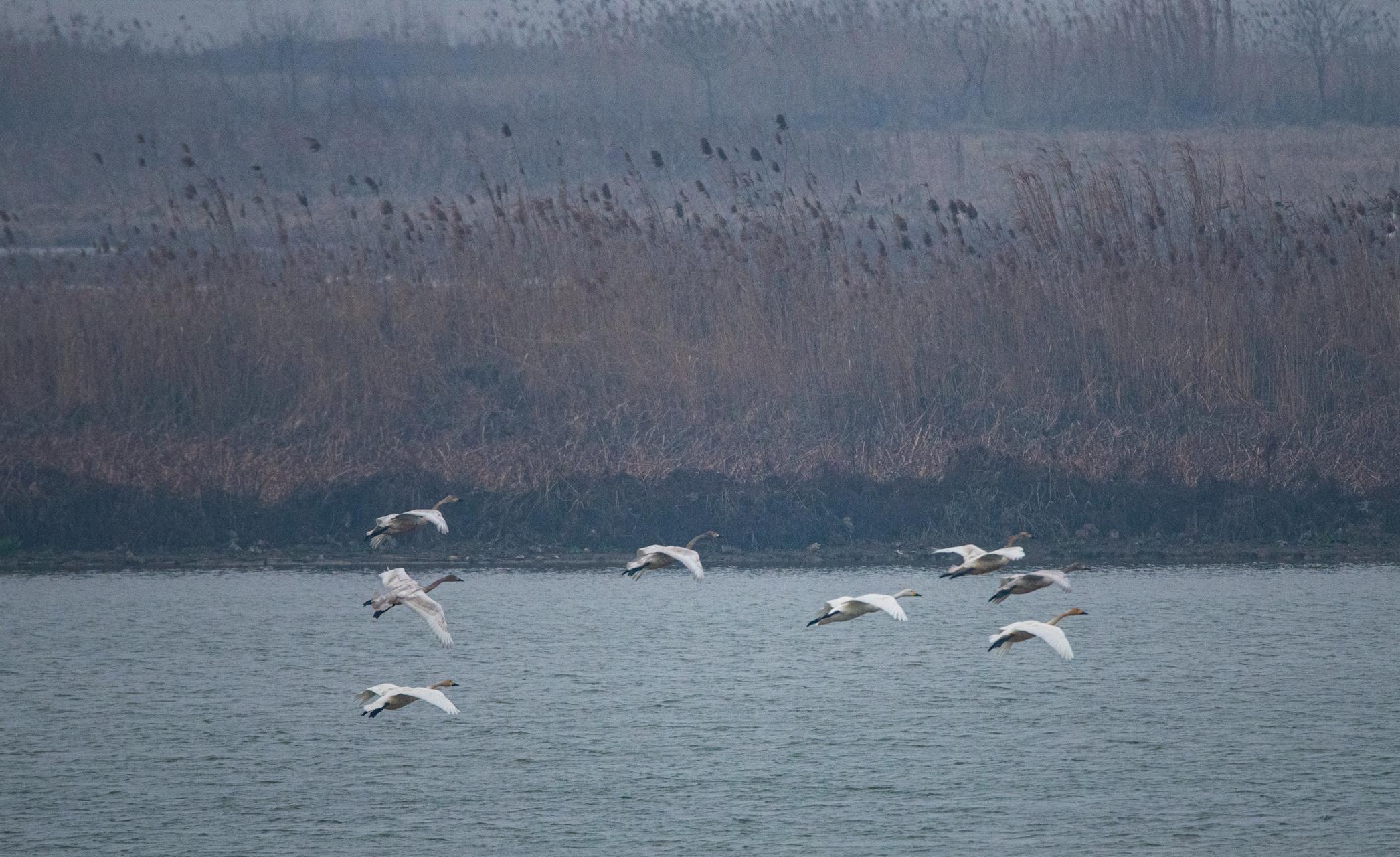 在采桑湖,刘科还拍到了8只小天鹅组成的鸟群,这8只中有几只是亚成鸟。他估计是刚在繁殖地长大就赶来洞庭湖越冬的。小天鹅的叫声极好辨认,很远就能听到。