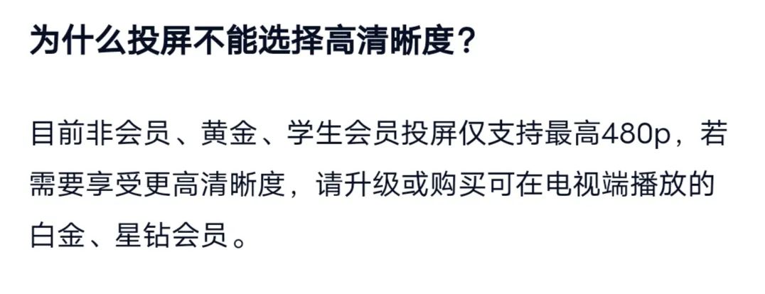 红星新闻记者也注意到,爱奇艺会员规定中介绍,非会员、黄金、学生会员投屏仅支持最高480p,若需要享受更高清晰度,需升级或购买可在电视端播放的白金、星钻会员。