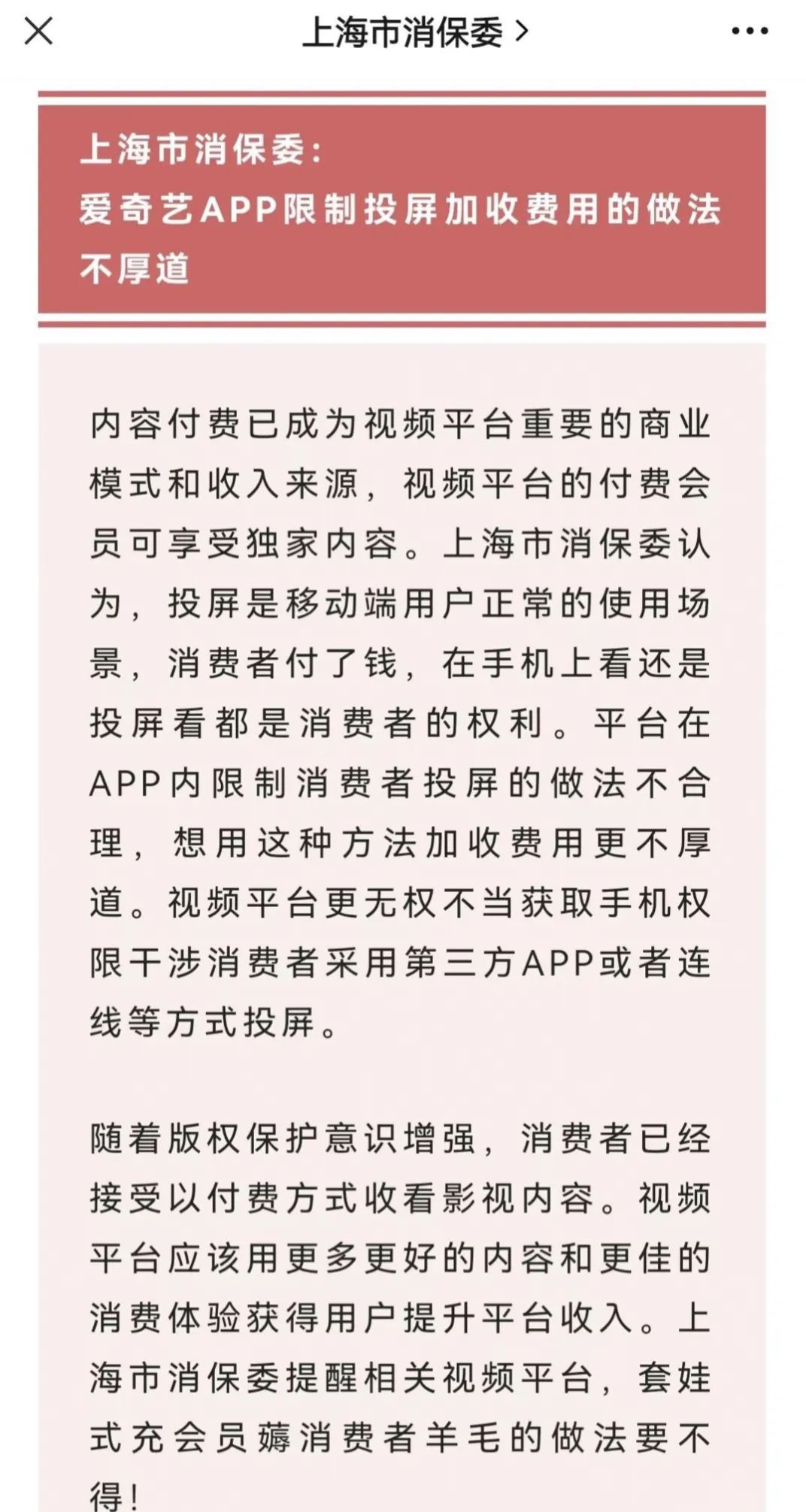 今年1月12日,上海消保委官方微信公众号曾发文批评爱奇艺限制用户投屏的行为。