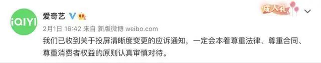随后,爱奇艺在官方微博上发布声明称,已收到关于投屏清晰度变更的应诉通知,一定会本着尊重法律、尊重合同、尊重消费者权益的原则认真审慎对待。