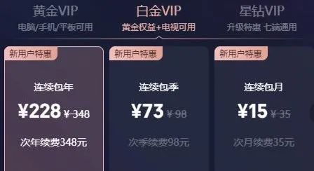 目前,爱奇艺黄金VIP会员连续包年价格为148元/年,白金VIP会员连续包年价格为228元/年。