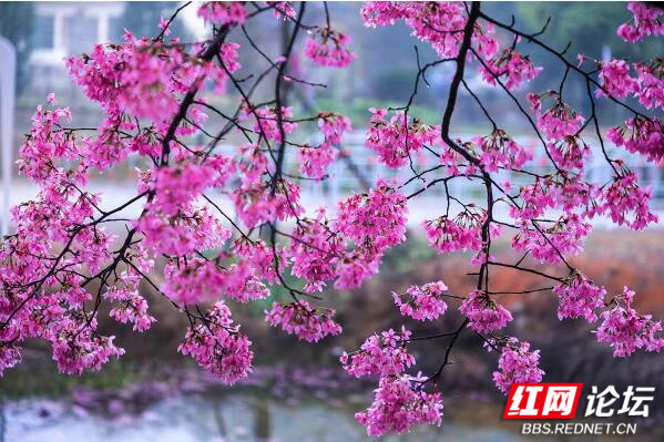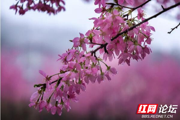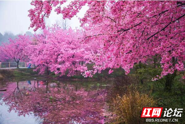 这里的樱花面积大、数量多、品种丰富,有中国红、关山樱、香水樱、红粉佳人、台湾八重樱等8个品种,走进樱花园,粉红一片,朵朵盛开,在小雨的滋润下,浓艳欲滴,煞是惹人喜爱……