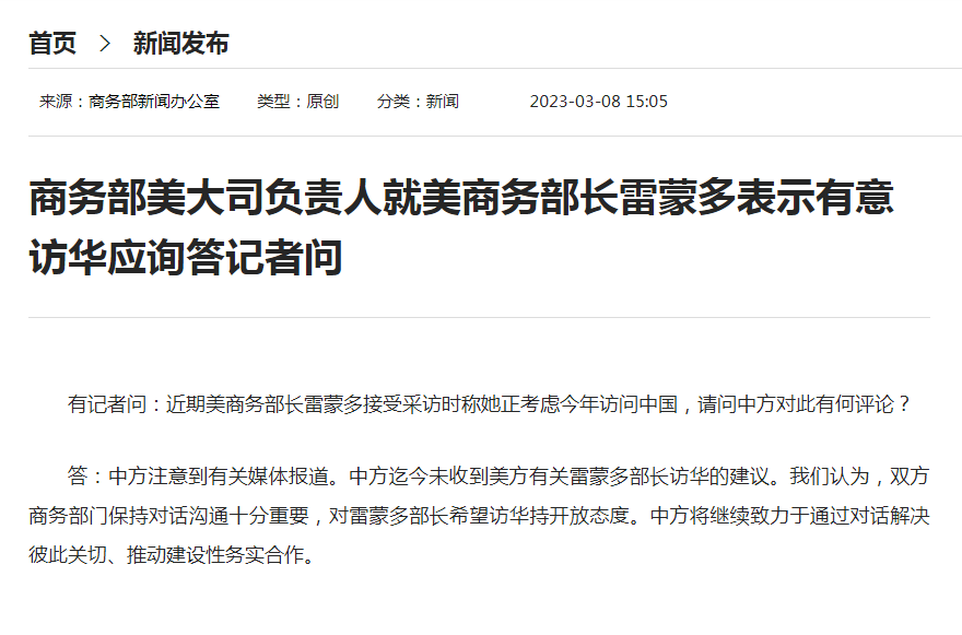 据商务部网站3月8日消息,商务部美大司负责人就美商务部长雷蒙多表示有意访华应询答记者问。