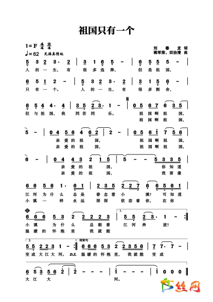 《祖国只有一个》歌词简洁集中,旋律优美大气。在副歌部分,把我们每个人细化成一条涓涓溪流,把伟大祖国比喻成滔滔江河,提炼出了“小溪汇入江河就能变成江河”的真理性词句,与主歌相呼应,在演唱者充满真情的歌声的渲染之下,突出了爱国主义是成就伟大人生的巨大力量,强化了爱国主义的情感色彩,具有较强的艺术感染力。