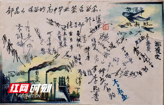 1955年高中毕业,全班同学和任教老师在岳阳楼合影留念。毕业典礼结束,照片发下来,我十分高兴,准备了一个漂亮的信封收藏照片。信封画面很美,上方蓝天白云,飞机翱翔,下方烟囱林立,霞光闪亮,显示出天地广阔,前途光明。我灵机一动,何不请影中人在信封上签名留念呢?于是便拿着信封,恭恭敬敬逐个请求签名。成就了这个签名信封,锁住了记忆。