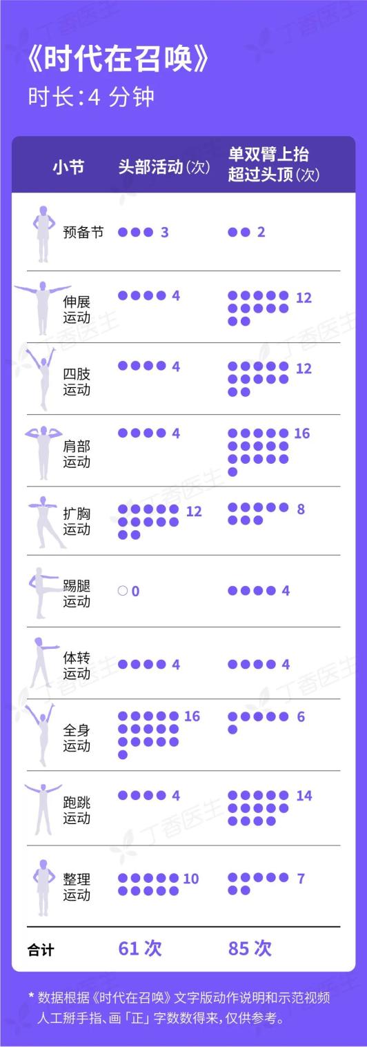 我们扒拉了一下广播体操动作指导以及示范视频,以《时代在召唤》为例,短短 4 分钟左右的时间,抬头扭头 61 次,单双臂上抬超过头顶 85 次。