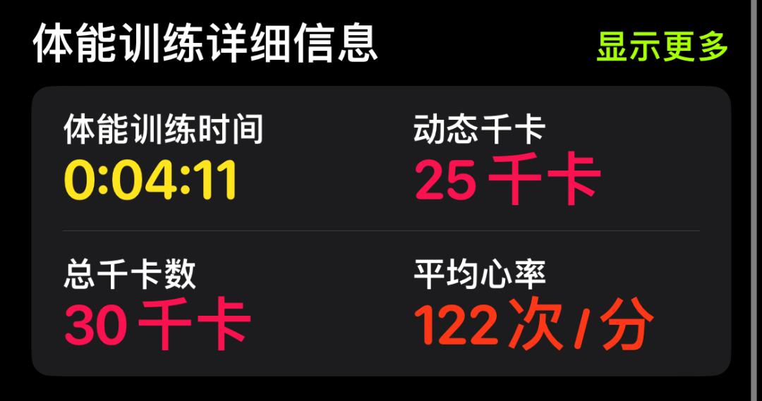做一遍《时代在召唤》,最高心率接近 140 次/分钟,消耗了 30 千卡。