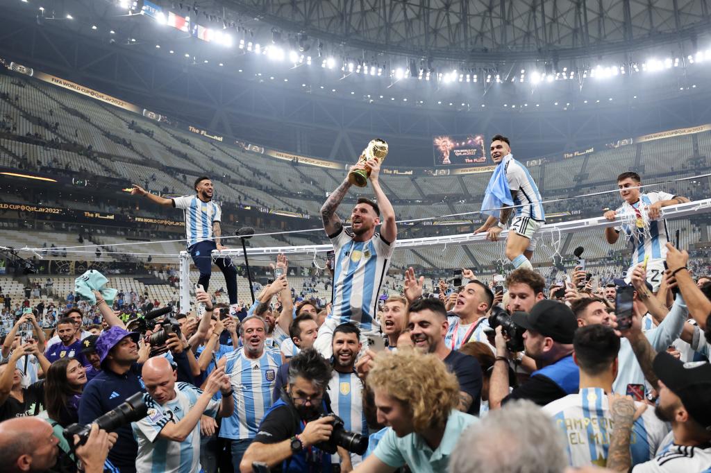 2022年12月18日,阿根廷队球员梅西(上左二)在比赛后手捧大力神杯庆祝。新华社记者曹灿摄