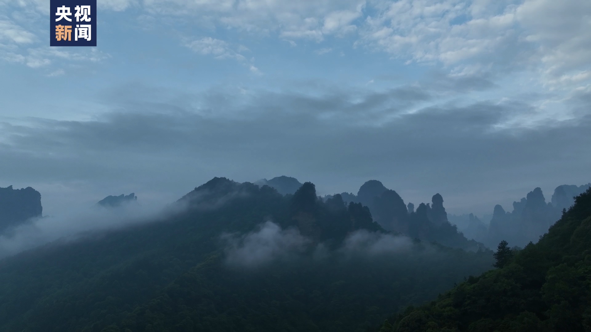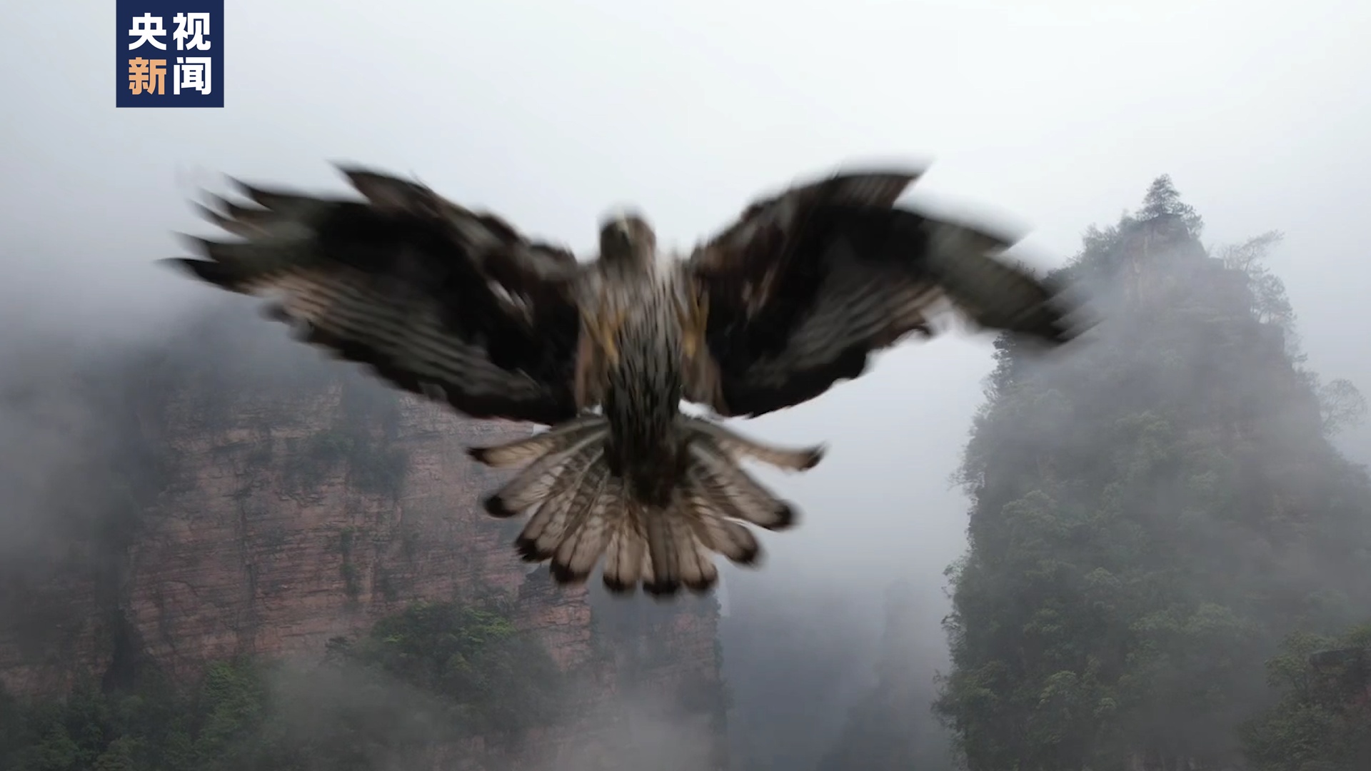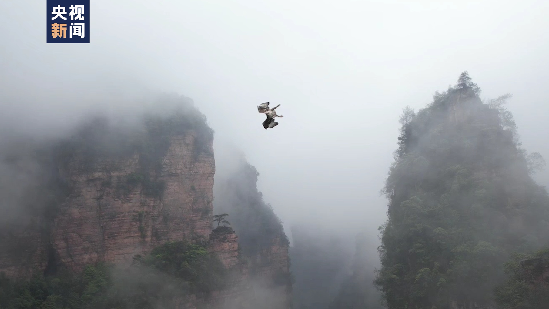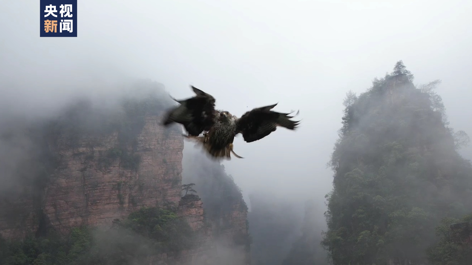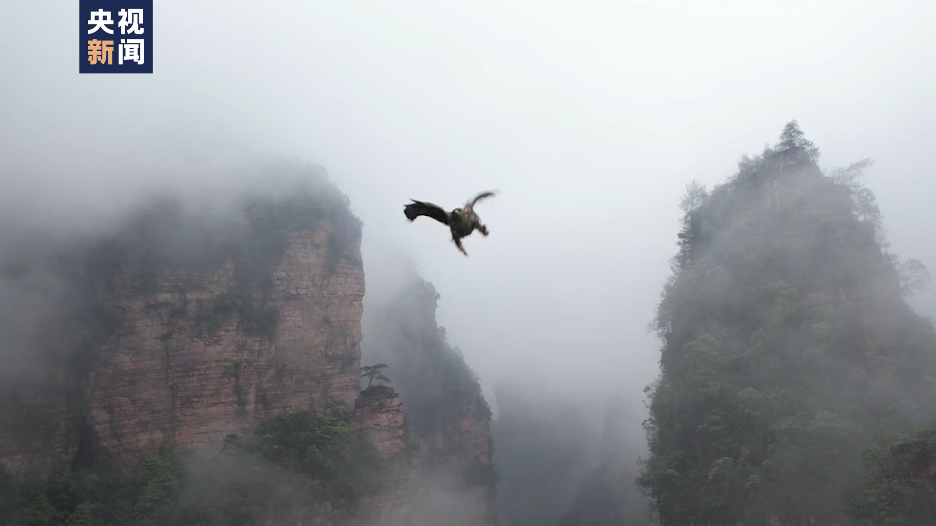 5月10日上午,在张家界九天峰恋景区,当地融媒体中心的记者正遥控无人机拍摄雨后云雾中的石英砂岩峰林美景。画面中,无人机穿越纵深达数百米的石柱,石壁的裂隙处,郁郁葱葱长着不少植被。而这里的悬崖峭壁、凹处石沿,位置险峻难以攀登接近,正是猛禽筑巢的不二之选。