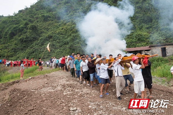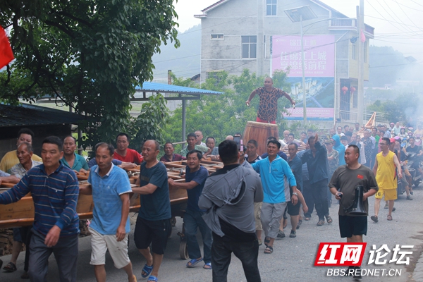 当天,人们划旱龙舟、打腰鼓、供猪头、杀鸡、敬神,全村所有人出动,步行3公里,护送龙舟下水,场面十分的隆重。