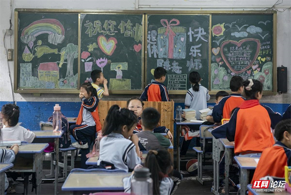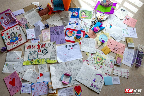 全班学生听说陈老师马上就要退休了,自发在黑板上描画爱心祝福和绘制形式各样的爱心小卡片来表达对老师的爱。他们在黑板上写道:您是我们见过最优秀、最温暖、最爱干净的老师!