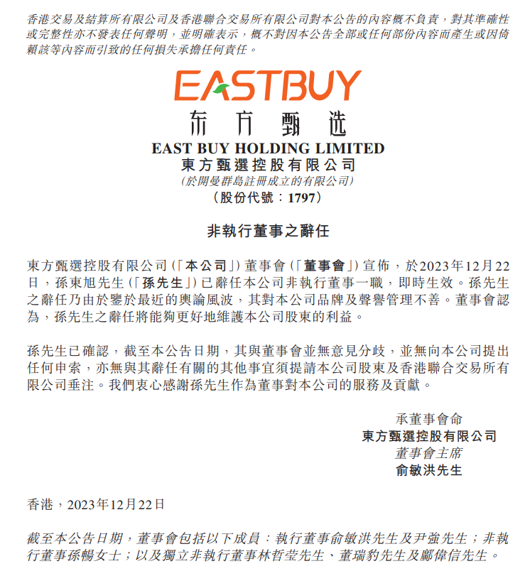 12月22日晚,东方甄选在港交所公告称,12月22日,孙东旭已辞任公司非执行董事一职,即时生效。孙东旭的辞任是鉴于最近的舆论风波,其对公司品牌及声誉管理不善。东方甄选董事会认为,孙东旭的辞任,将能够更好地维护公司股东的利益。