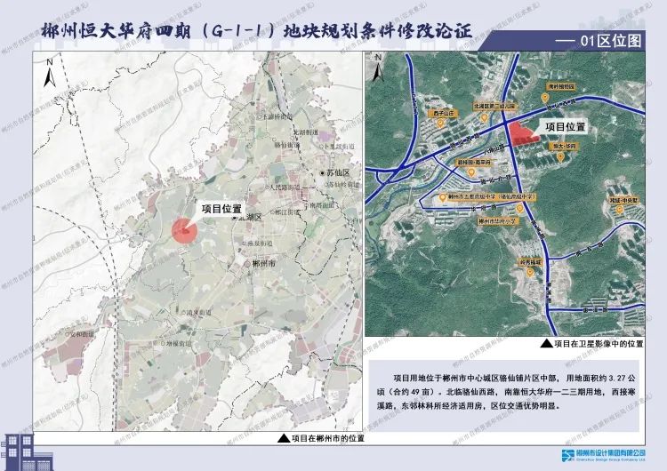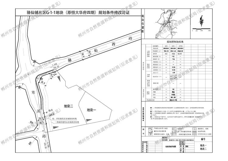 骆仙铺片区G-1-1地块(原恒大华府四期)位于骆仙西路与寒溪路交汇处东南侧(详见区位图)。现郴州市百福投资集团有限公司申请调整该地块规划条件,调整后规划用地面积约32666平方米(约49亩),用地性质为城镇住宅用地(0701)兼容部分商业(0901),综合容积率<3.72。其中,地块一用地面积约7524平方米,容积率4.5;地块二用地面积约25141平方米,容积率<3.5,建筑密度<22%,绿地率>35%,兼容商业≤3.99%,建筑限高100米。为便于下步规划许可,依据《湖南省实施<中华人民共和国城乡规划法>办法》有关规定,现将该地块规划条件予以公示,请广大市民提出宝贵意见。