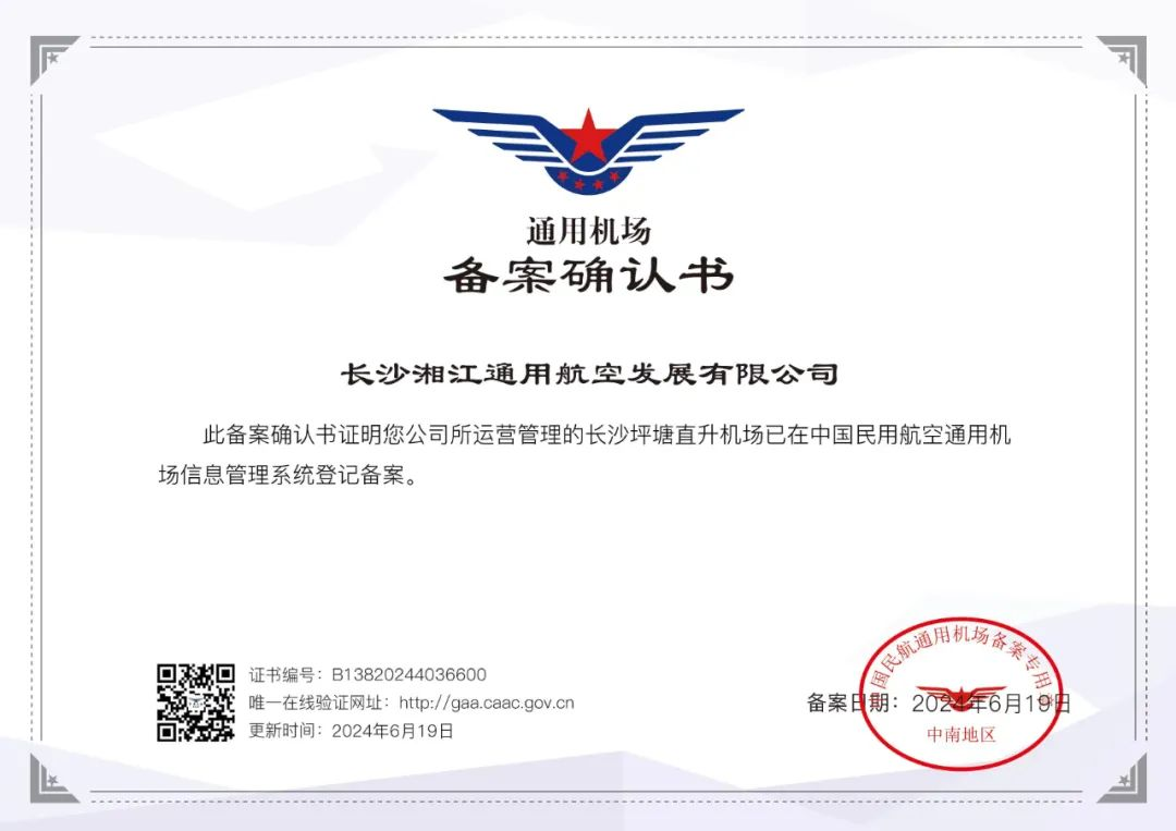6月21日,记者从湘江集团旗下的长沙湘江通用航空发展有限公司(简称“湘江通航公司”)获悉,其建设并运营的长沙坪塘直升机场,已正式在中国民用航空通用机场信息管理系统登记备案,是湘江新区第一个A1类直升机场。