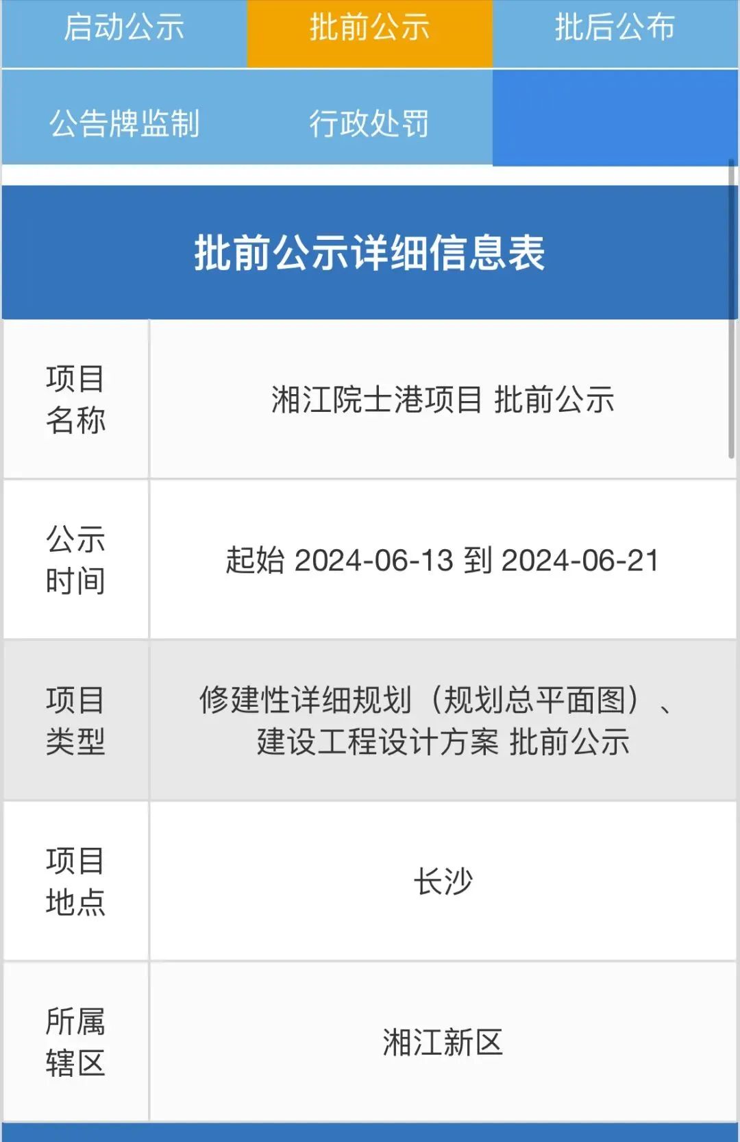 《湘江院士港项目 批前公示》,对项目的修建性详细规划(规划总平面图)及建设工程设计方案进行了公示。