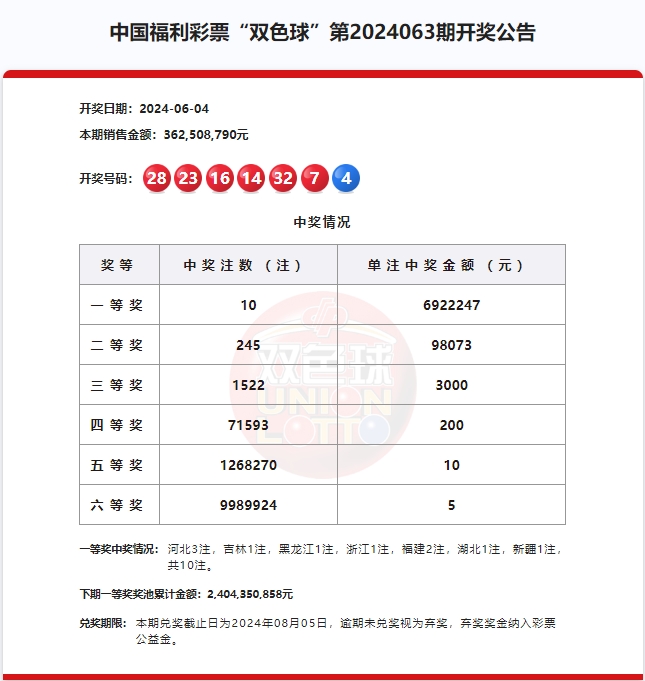 2024年6月4日中国福利彩票开奖信息