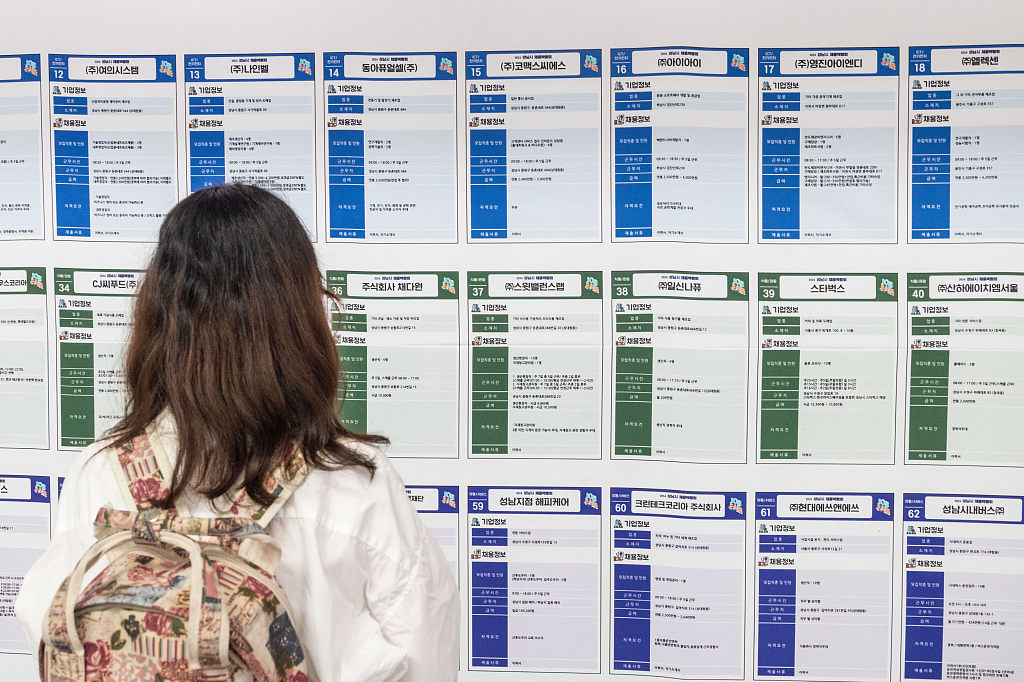 当地时间2024年4月26日,韩国城南市,一名求职者在市政府举办的青年招聘会上查看招聘启事。视觉中国 资料图