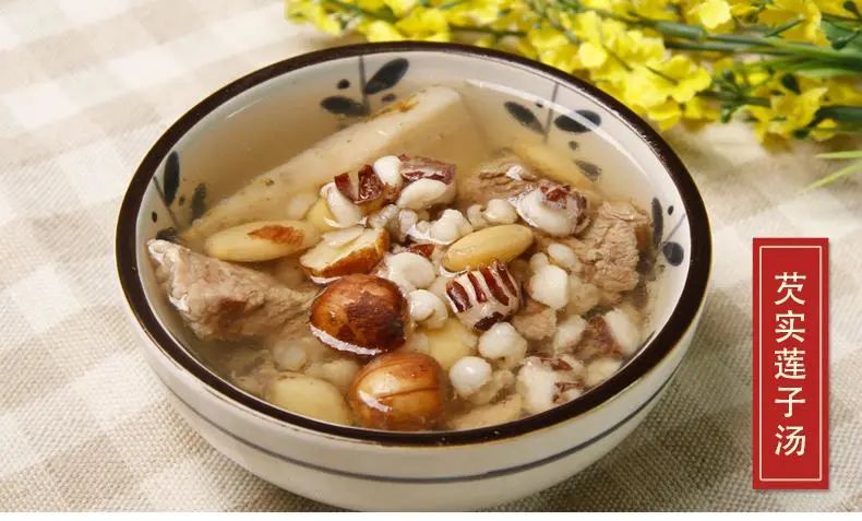 【做法】莲子、芡实、猪瘦肉加水用瓦煲煲汤,饮用时加少许盐调味,连渣服。