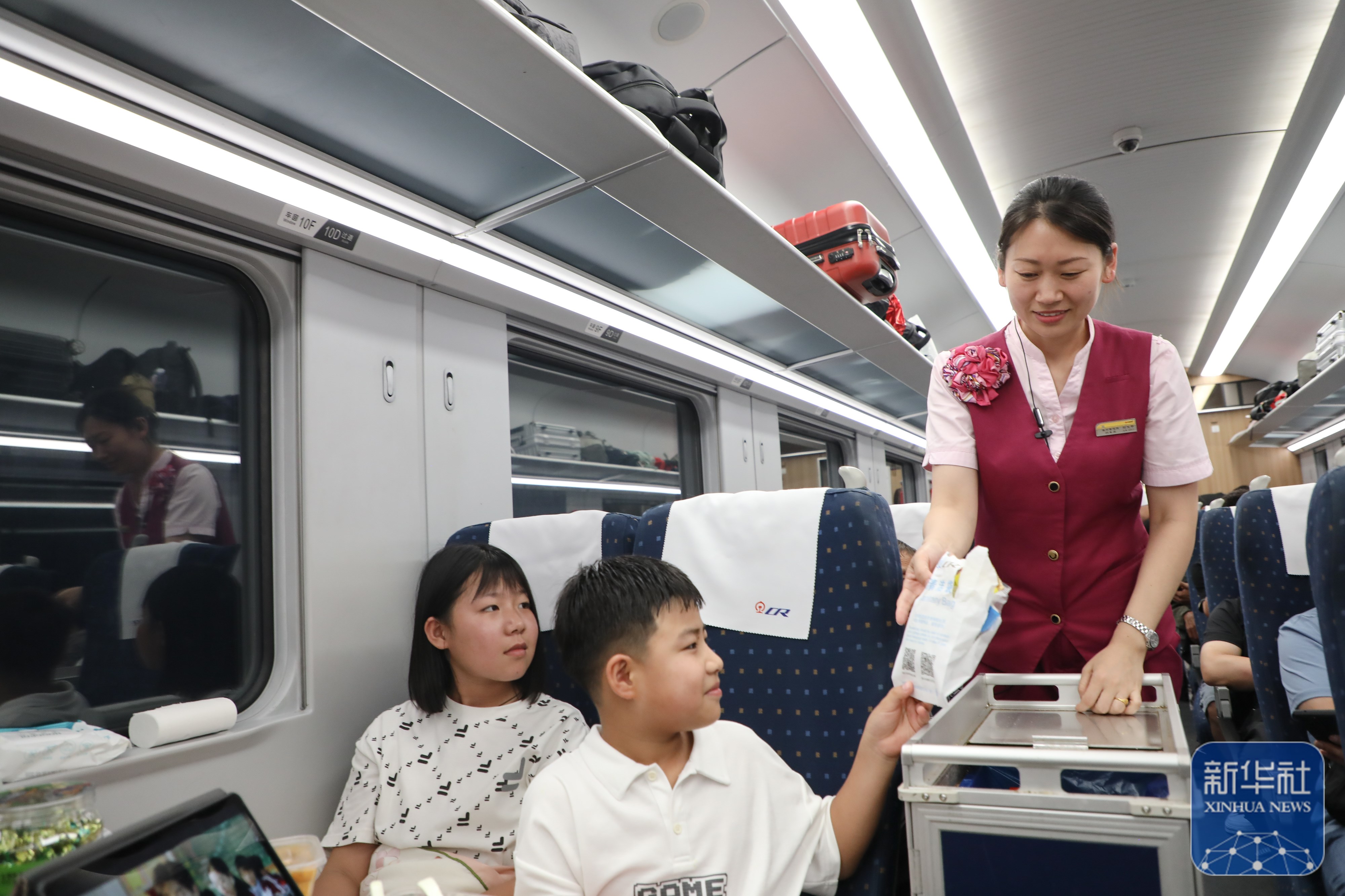眼下正值暑运,客流量持续高位运行。在北京丰台开往福州的D59次列车上,乘务组增加服务频次,南来北往的旅客在轻松愉悦的氛围中度过旅途中的时光。