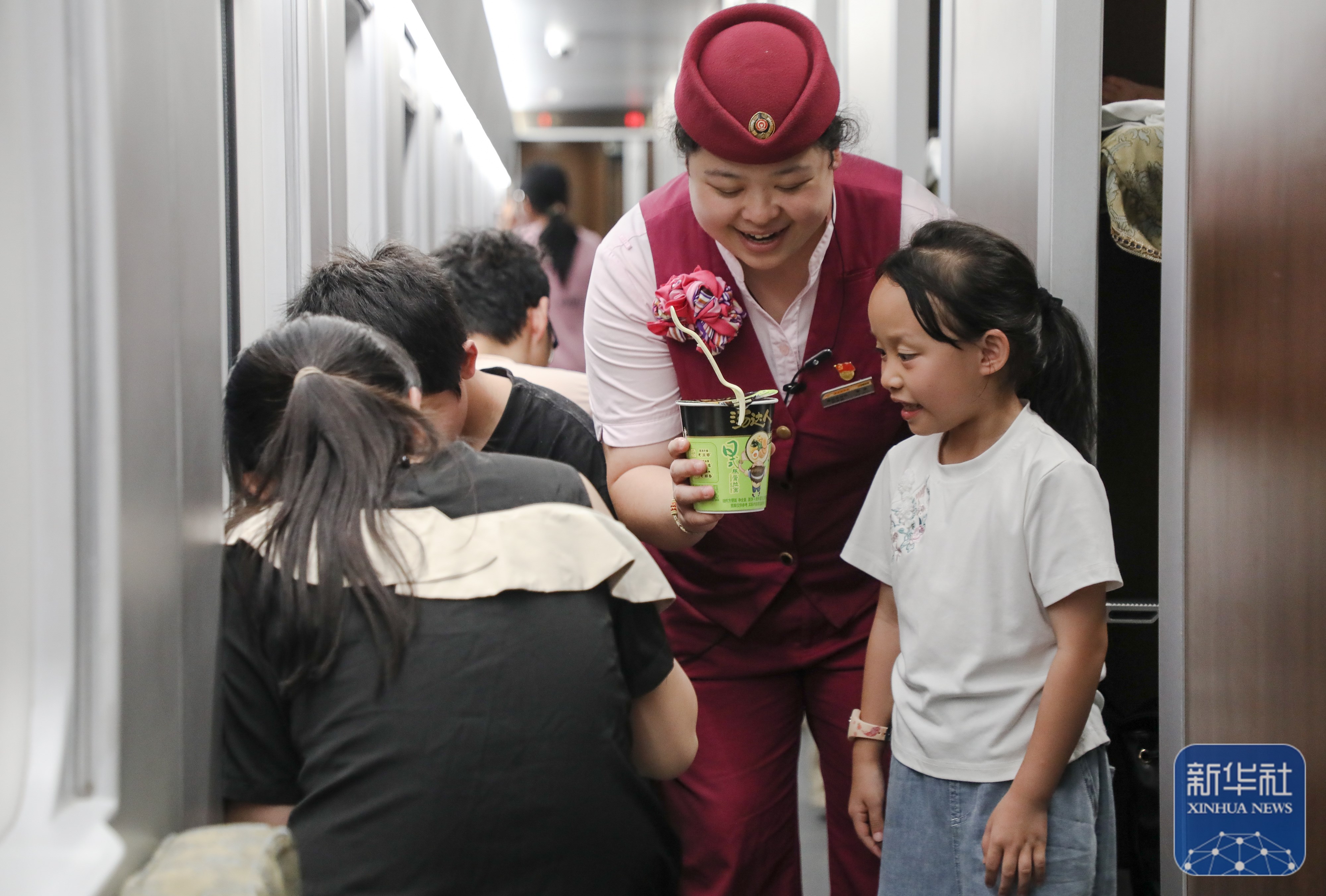 ↑8月1日,在北京丰台开往福州的D59次列车上,列车长帮助孩子端回加入热水的泡面。