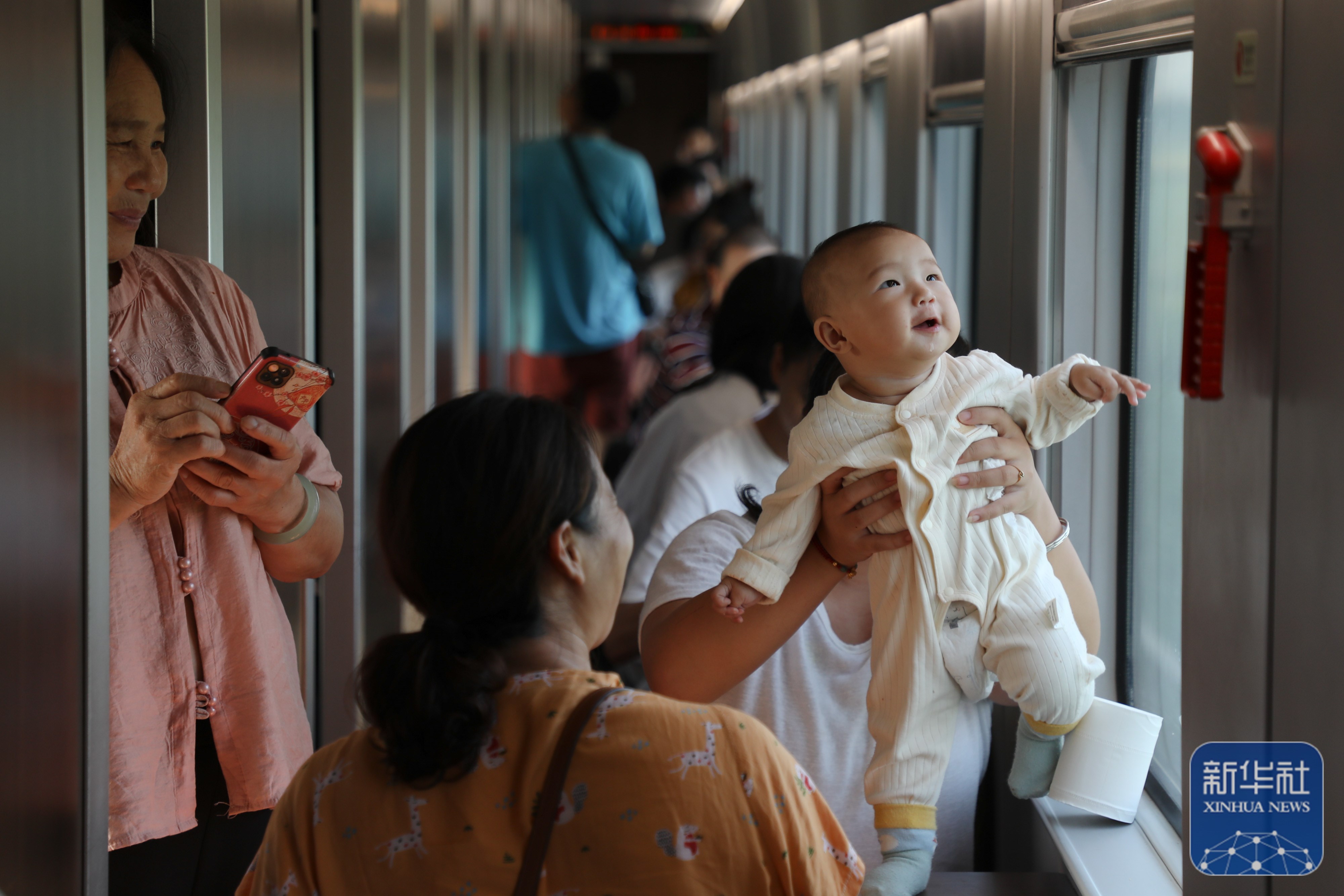 ↑8月1日,在北京丰台开往福州的D59次列车上,从北京旅游准备返回江西抚州的一家人与孩子逗乐。