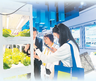 采购商在服贸会了解“智能家庭种植机”。本报记者 孔德晨摄