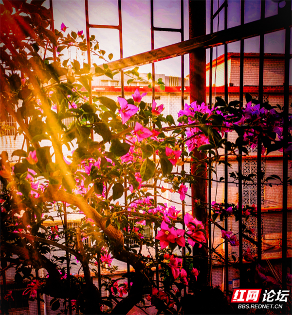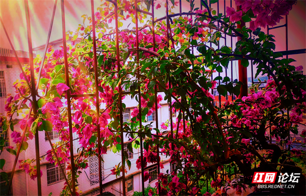 细软的花枝染上了烂漫的粉色,伸出窗外,形成一条条延绵绝美的“空中花廊”,随风摇曳,像红绡漫展,格外显眼。