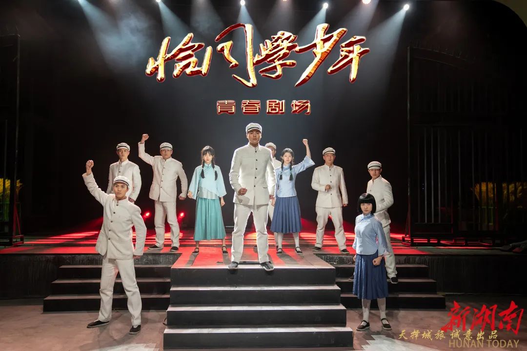在青春剧场里,游客用一小时的时间去穿越百年时空,与毛泽东、蔡和森、向警予等成为“同桌”“挚友”,于光影交织和行进互动中,与演员和场景交融体验,亲身“经历”那段红色记忆。
