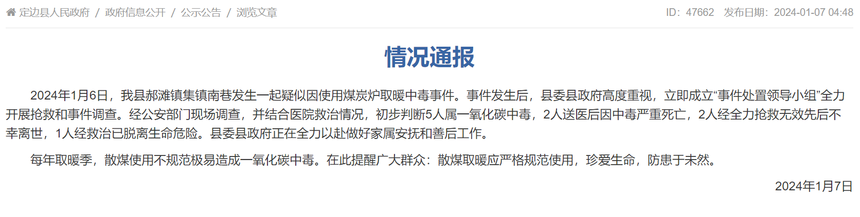 1月6日,陕西省榆林市定边县郝滩镇集镇南巷发生一起疑似因使用煤炭炉取暖中毒事件,7日凌晨,定边县发布情况通报。